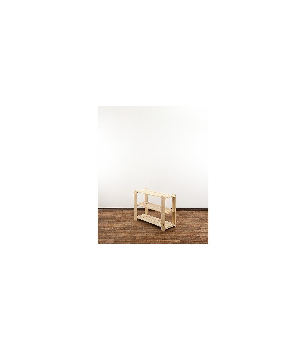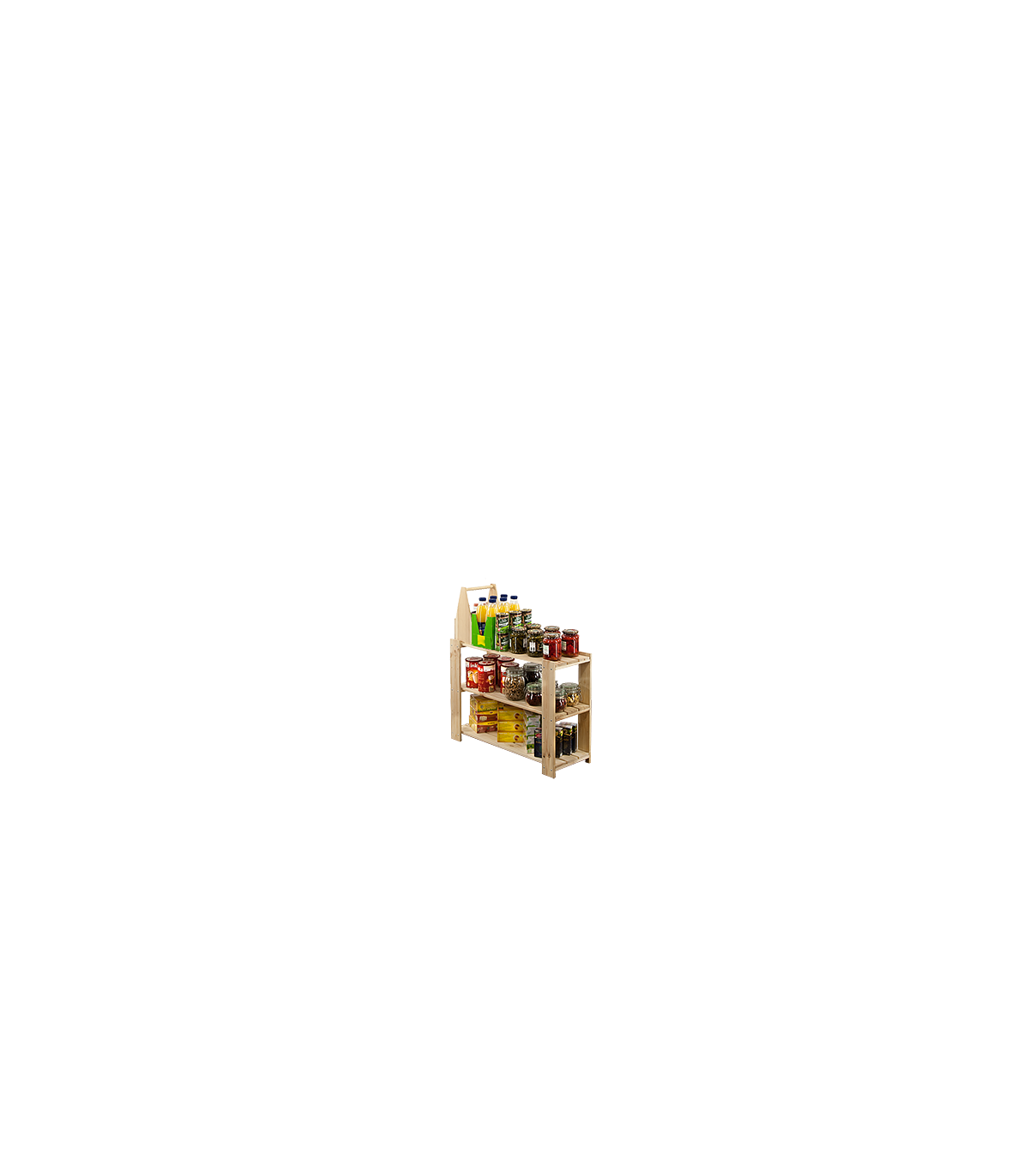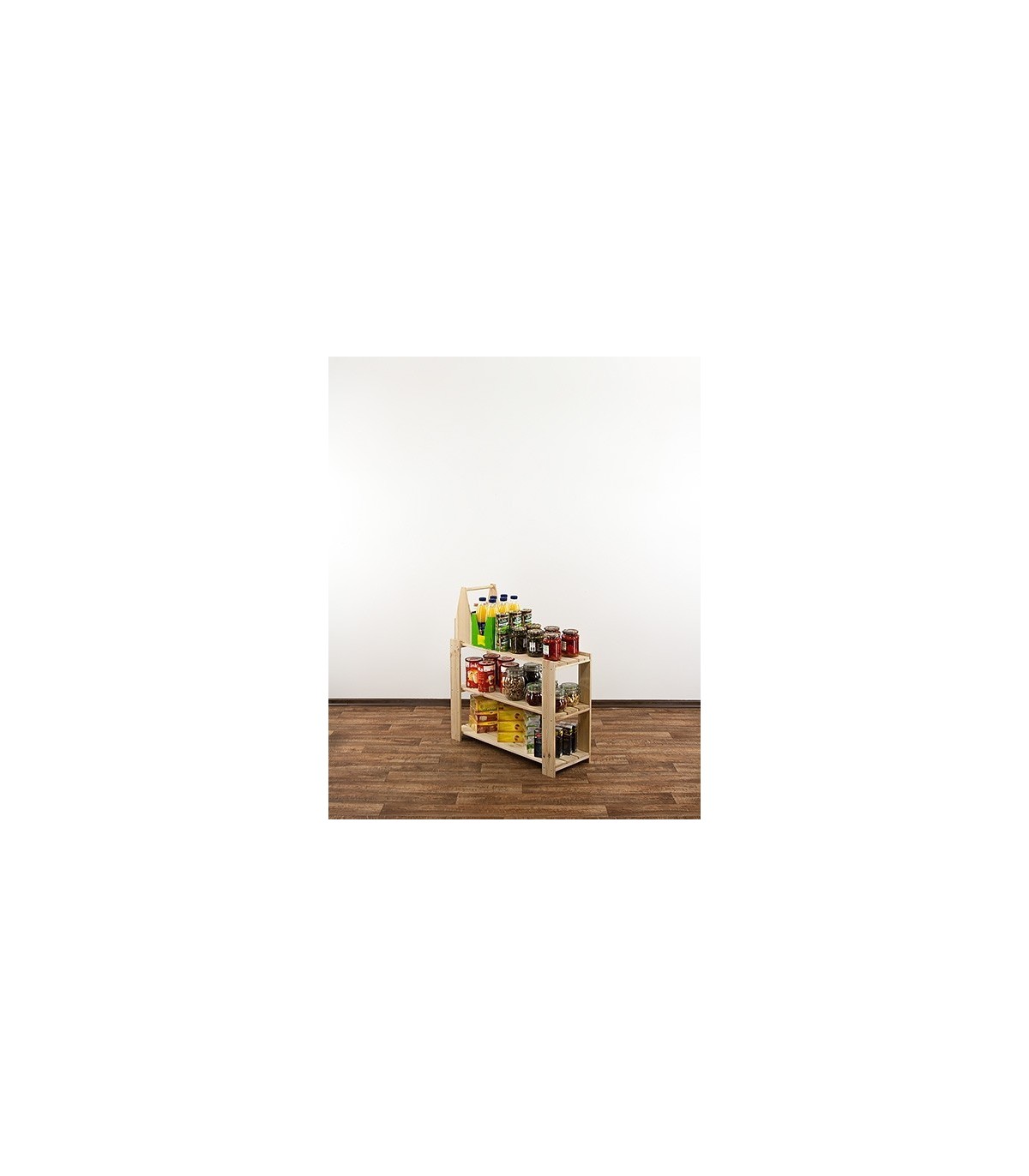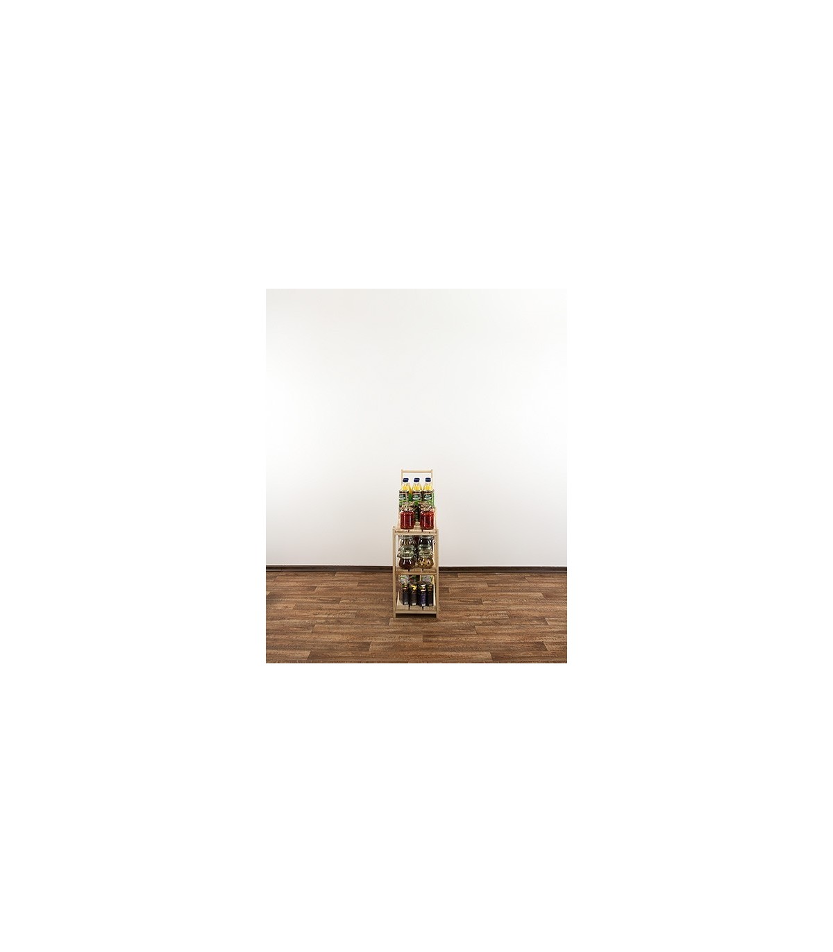 Wysoki na 64 cm, trzypiętrowy regalik o szerokości 80 i głębokości 30 cm. Boczne filary stojaka wyposażone są w rezerwowe otwory montażowe, umożliwiające regulację rozpiętości poziomów oraz instalowanie dodatkowych półek ażurowych lub półek na wino.