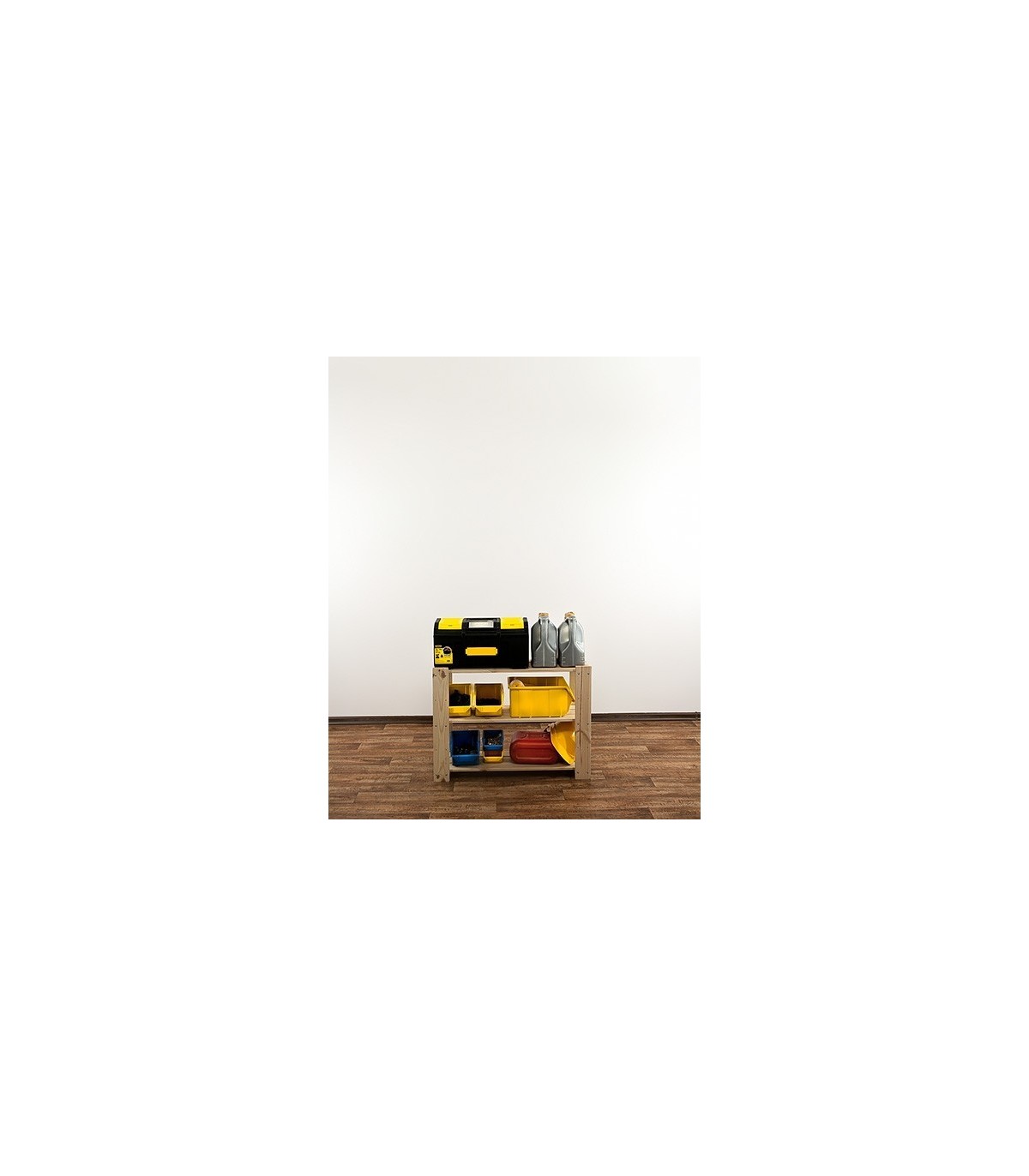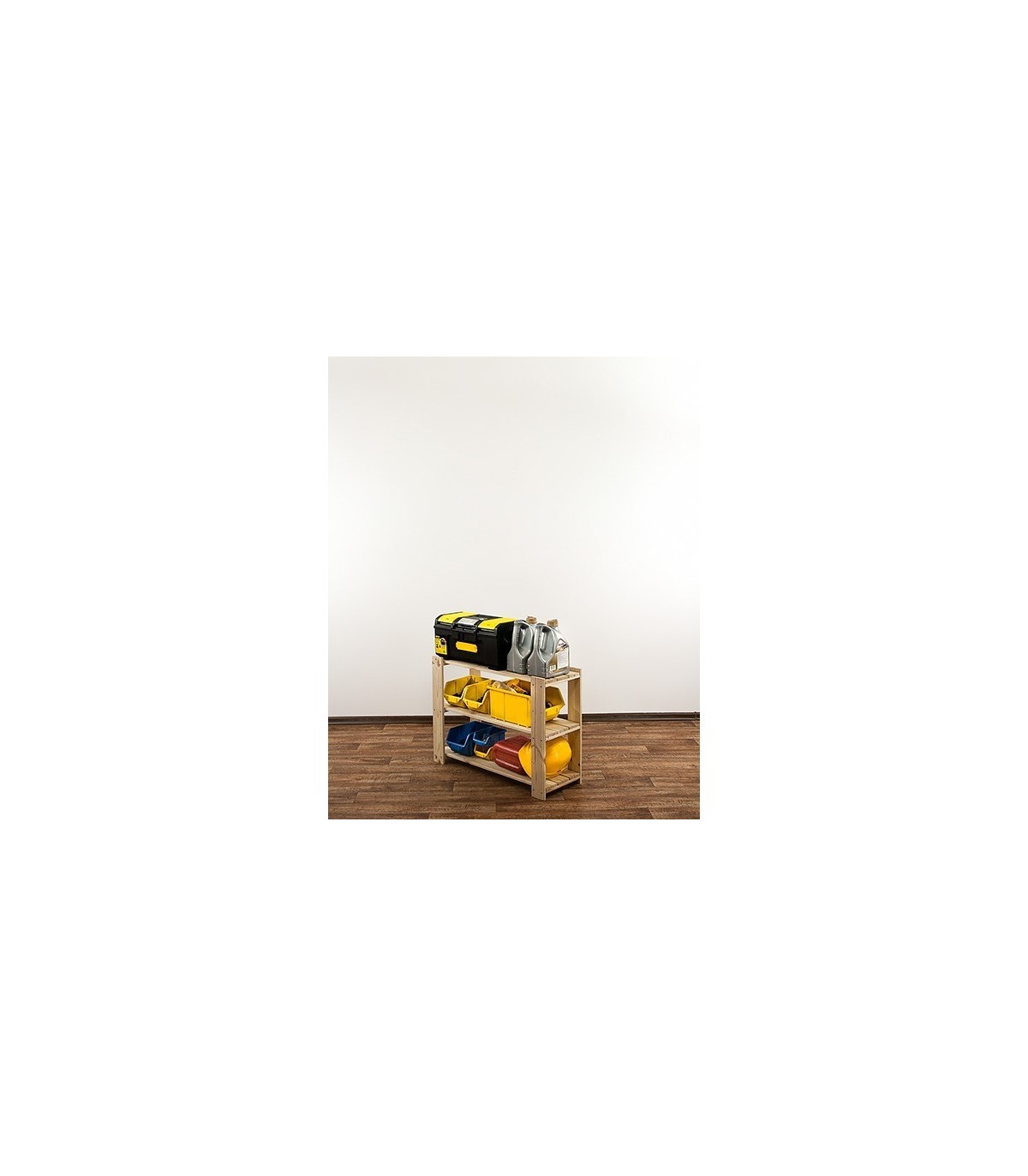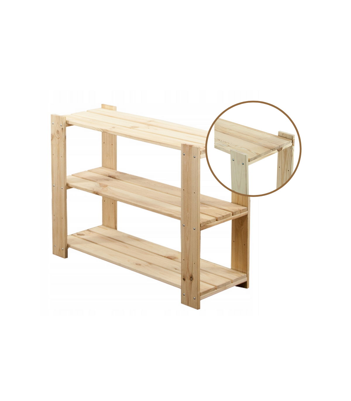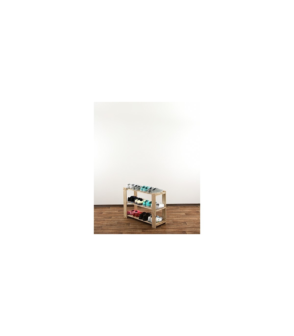 Wysoki na 64 cm, trzypiętrowy regalik o szerokości 80 i głębokości 30 cm. Boczne filary stojaka wyposażone są w rezerwowe otwory montażowe, umożliwiające regulację rozpiętości poziomów oraz instalowanie dodatkowych półek ażurowych lub półek na wino.
