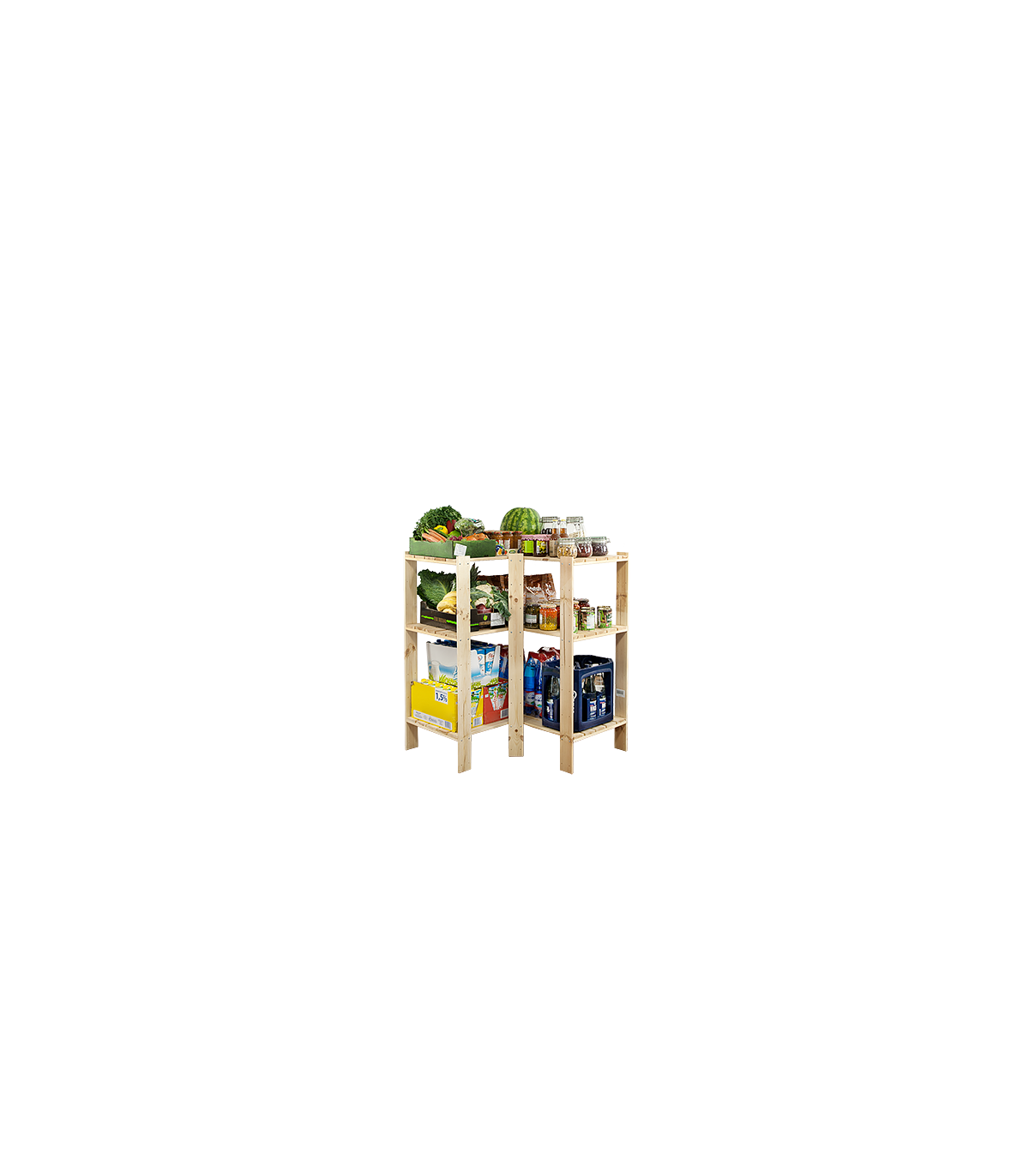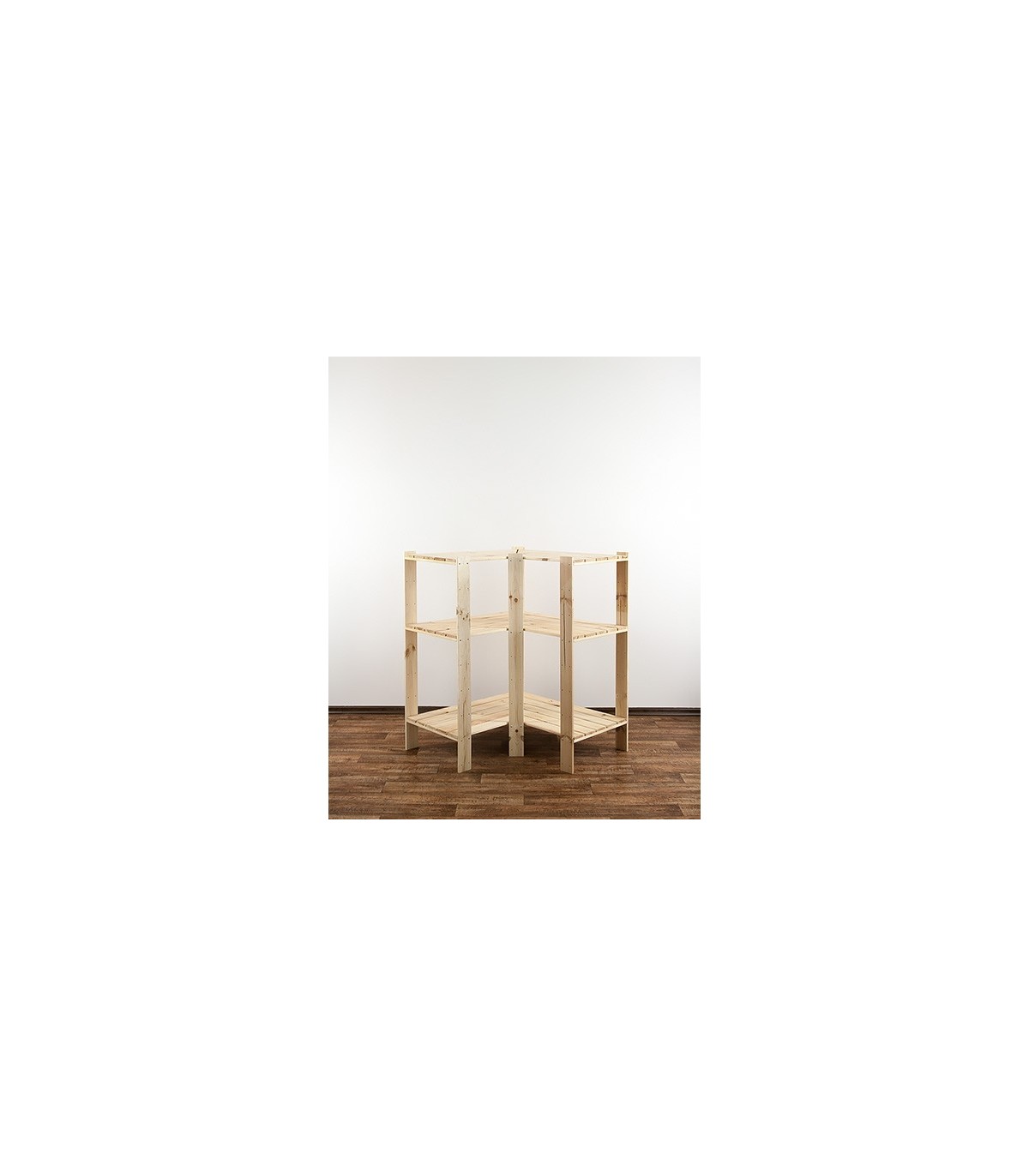 Trzypoziomowy regał narożny o wysokości 115, szerokości 85 i głębokości 50 cm. Stojak wyposażony jest w ażurowe półki z udźwigiem po 120 kg. Narożnik osadzony jest na pięciu filarach. Na całej długości boków znajdują się rezerwowe otwory montażowe, umożliwiające precyzyjną regulację wysokości poziomów.