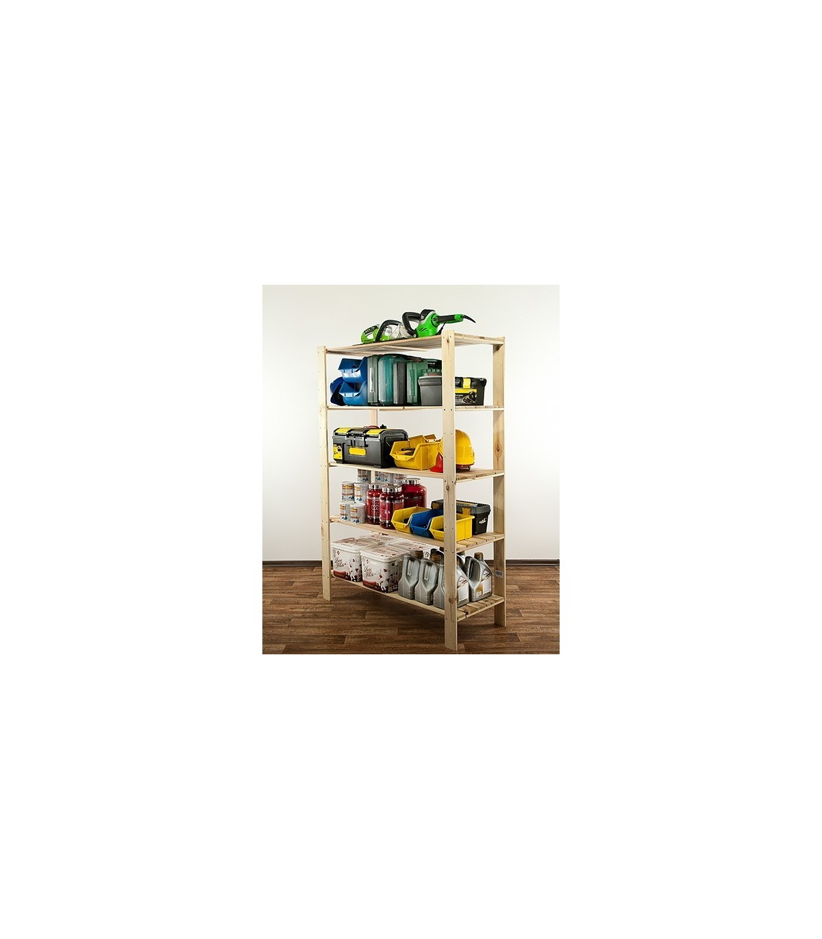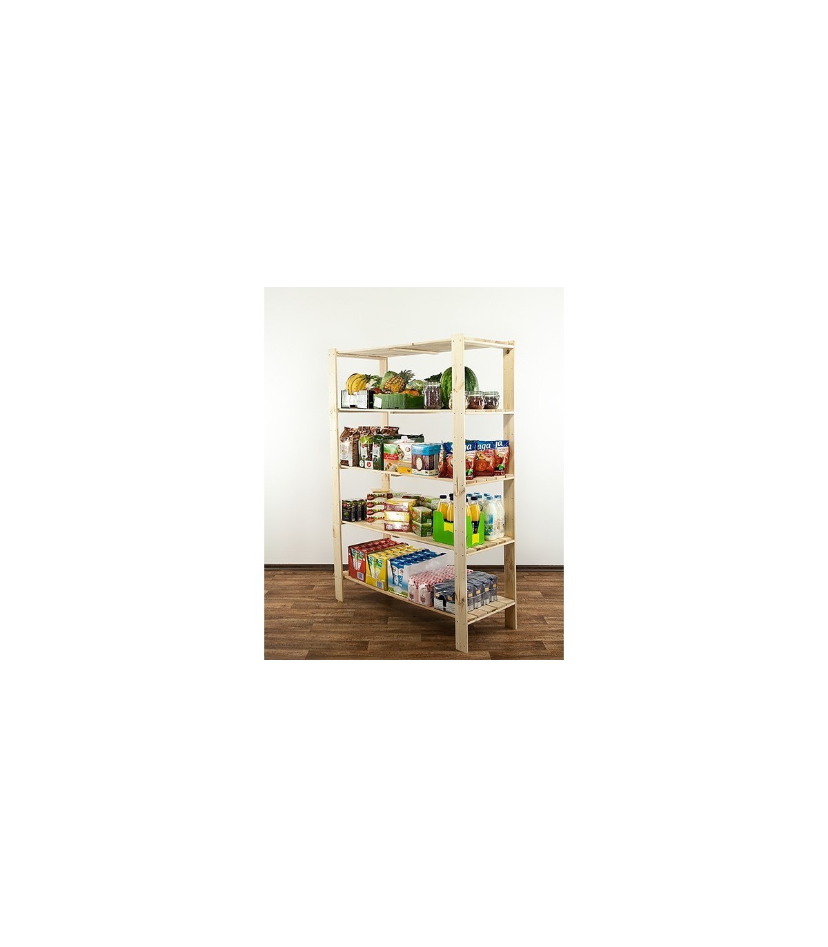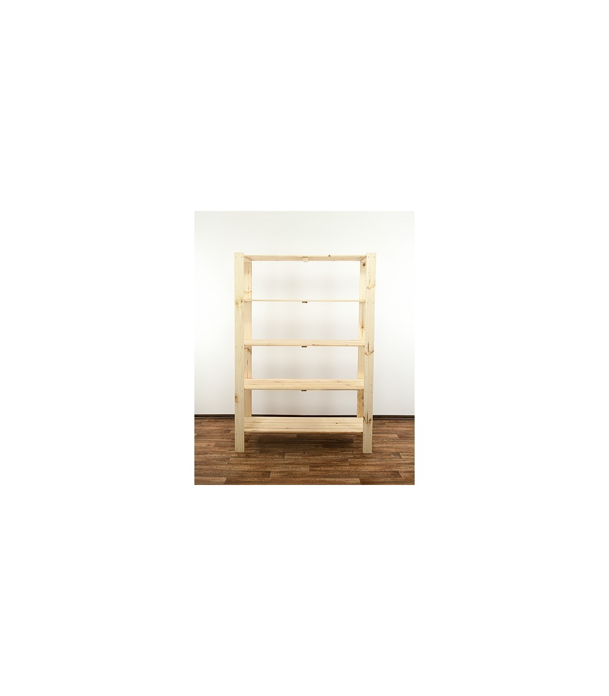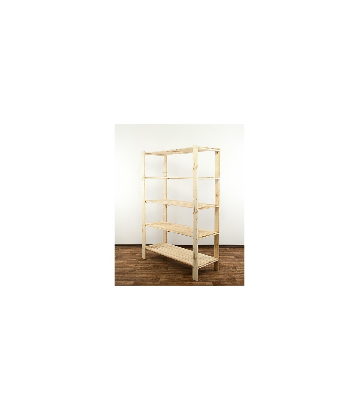 Pięciopiętrowy regał otwarty z drewna sosnowego. Ażurowe półki o nośności 100 kg każda.