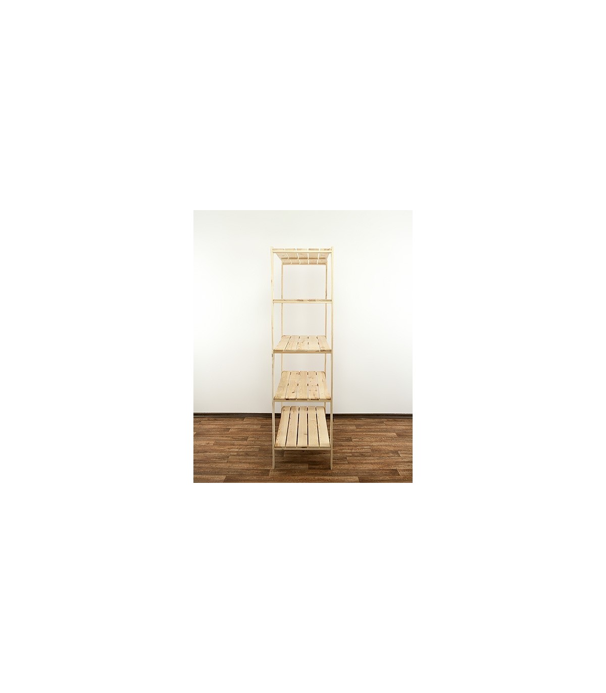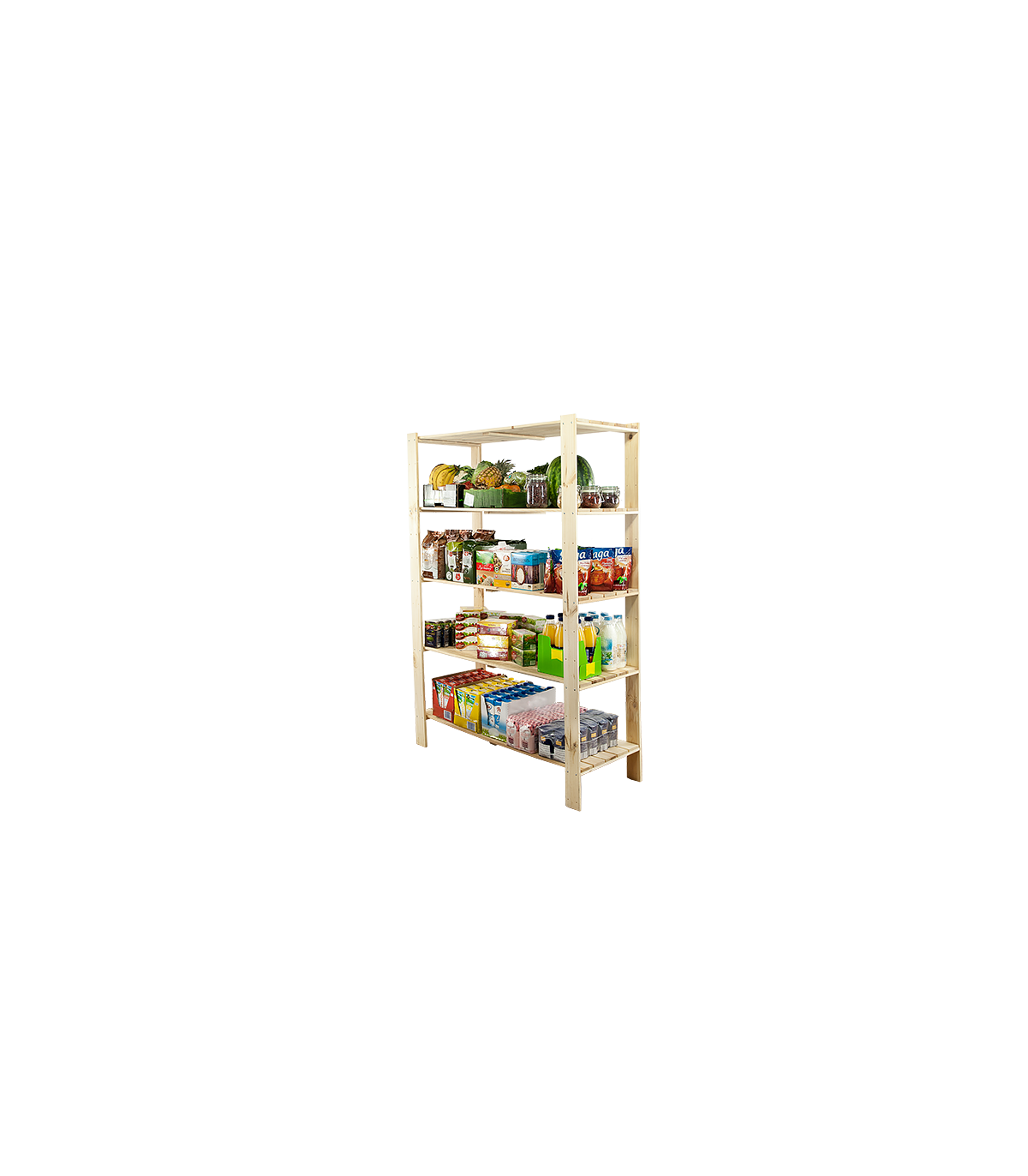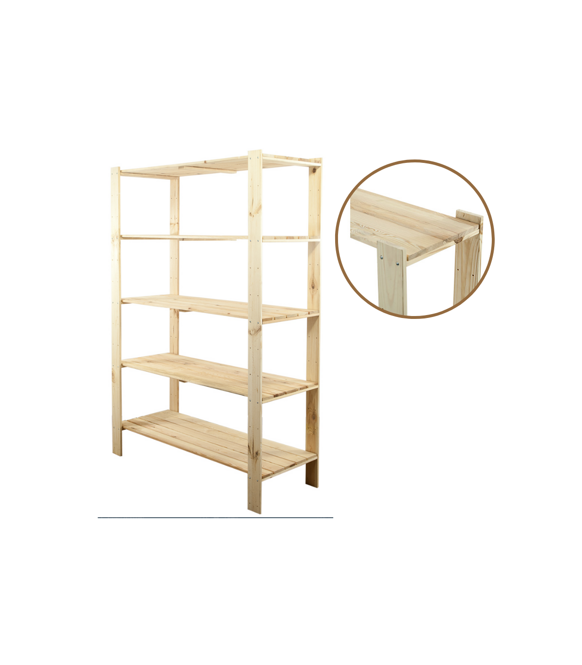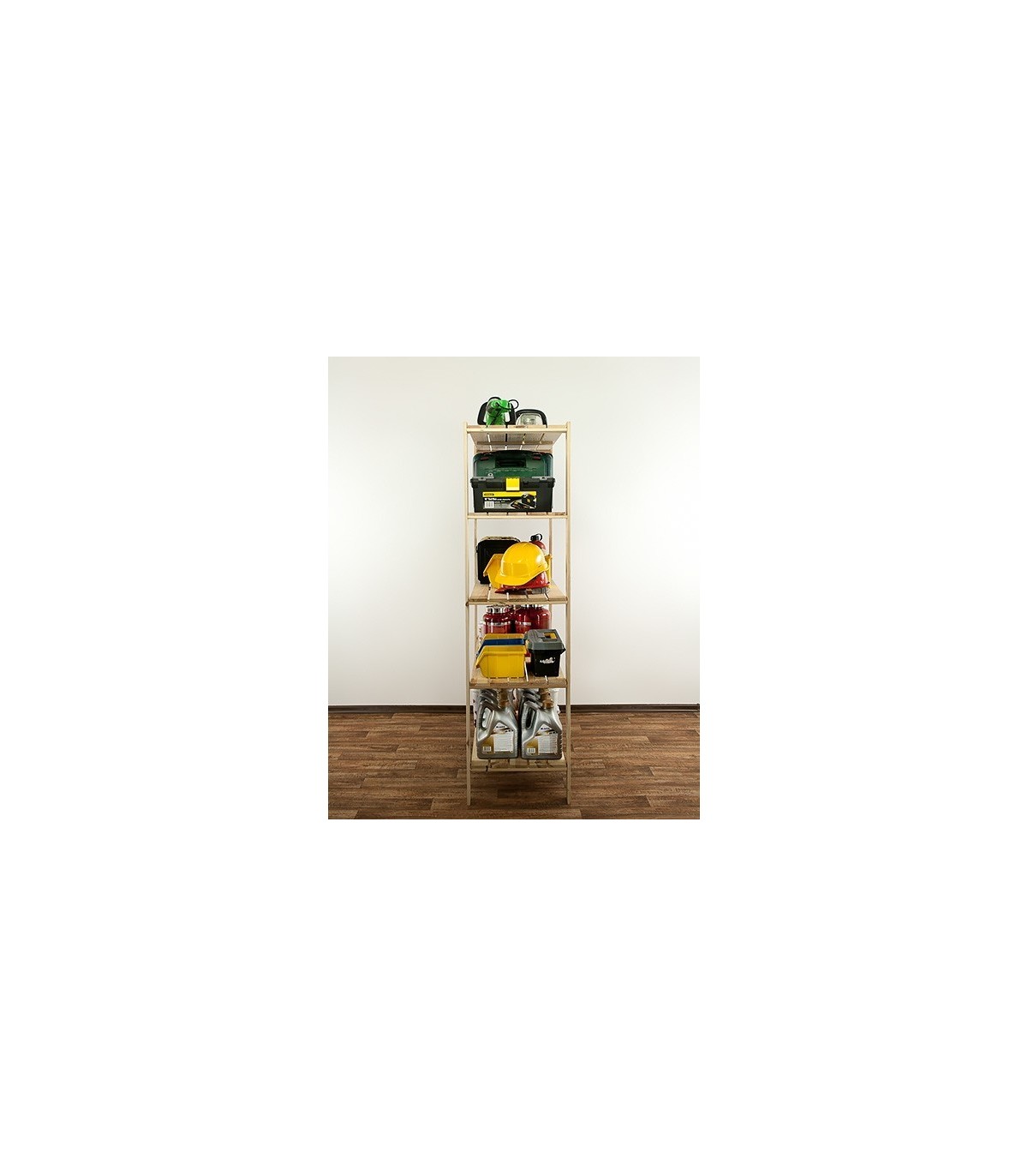 Pięciopiętrowy regał otwarty z drewna sosnowego. Ażurowe półki o nośności 100 kg każda.