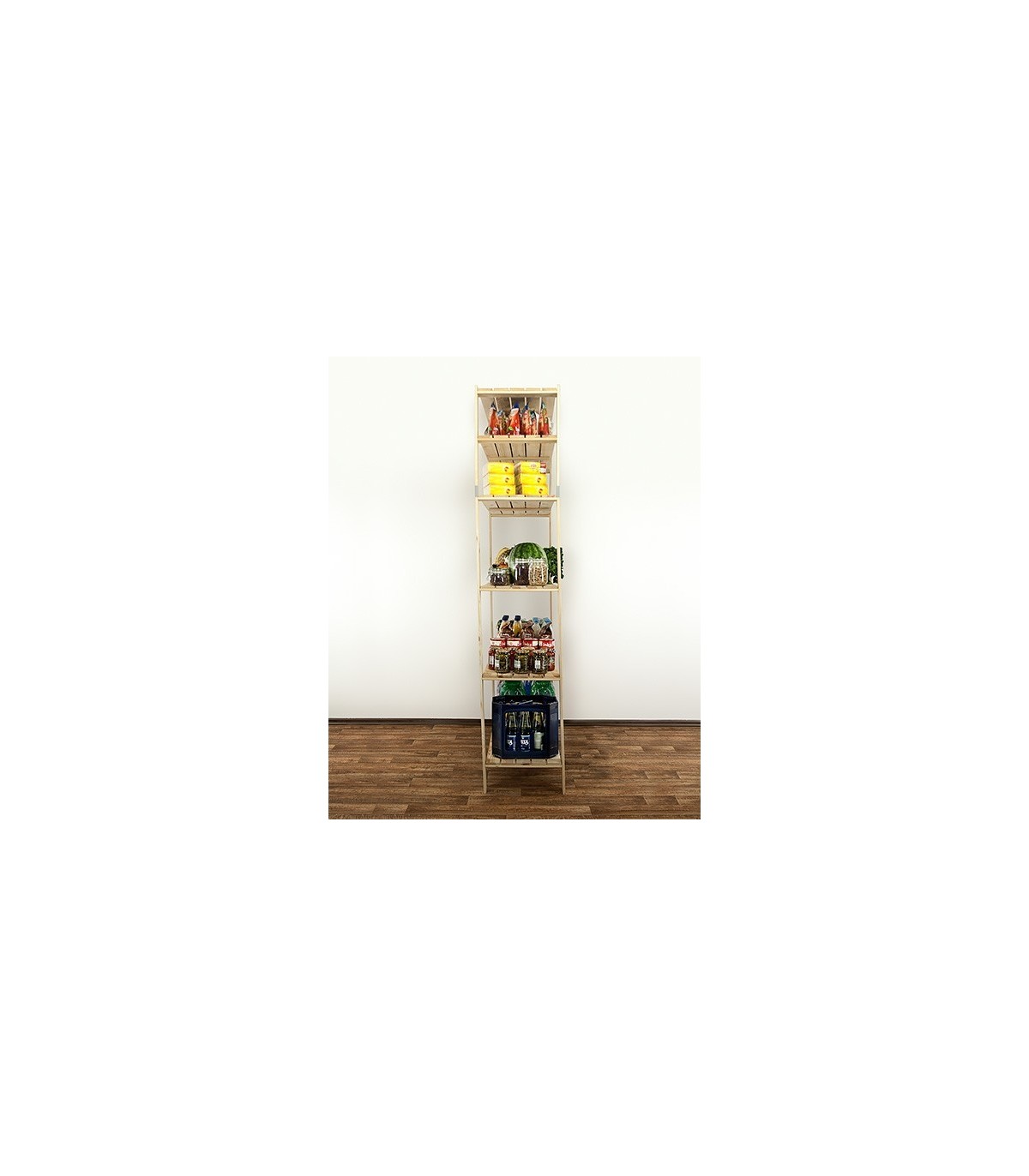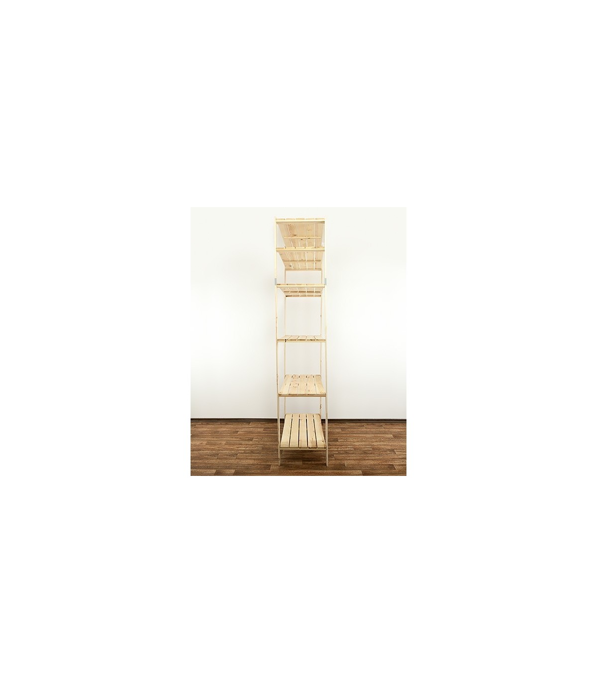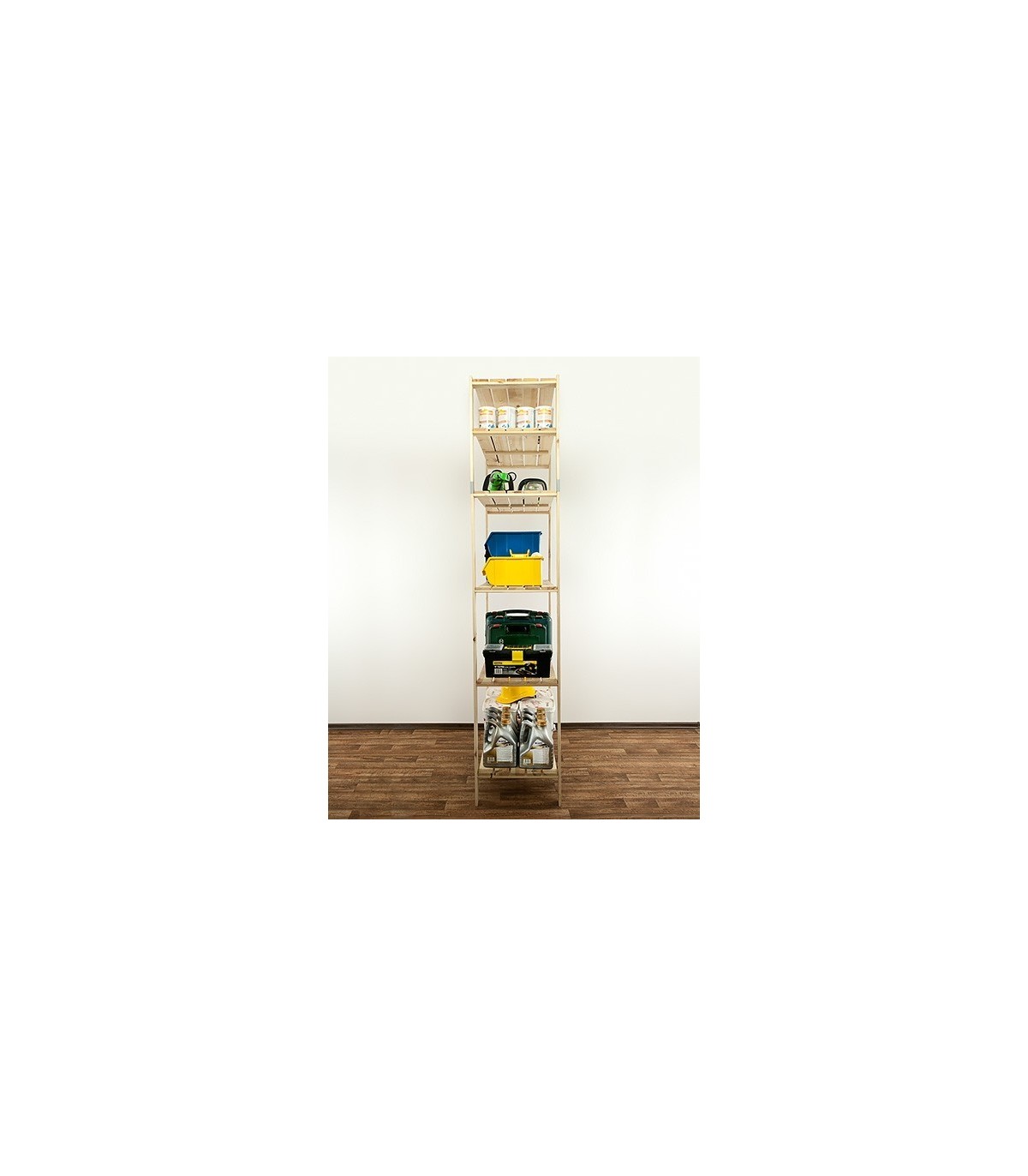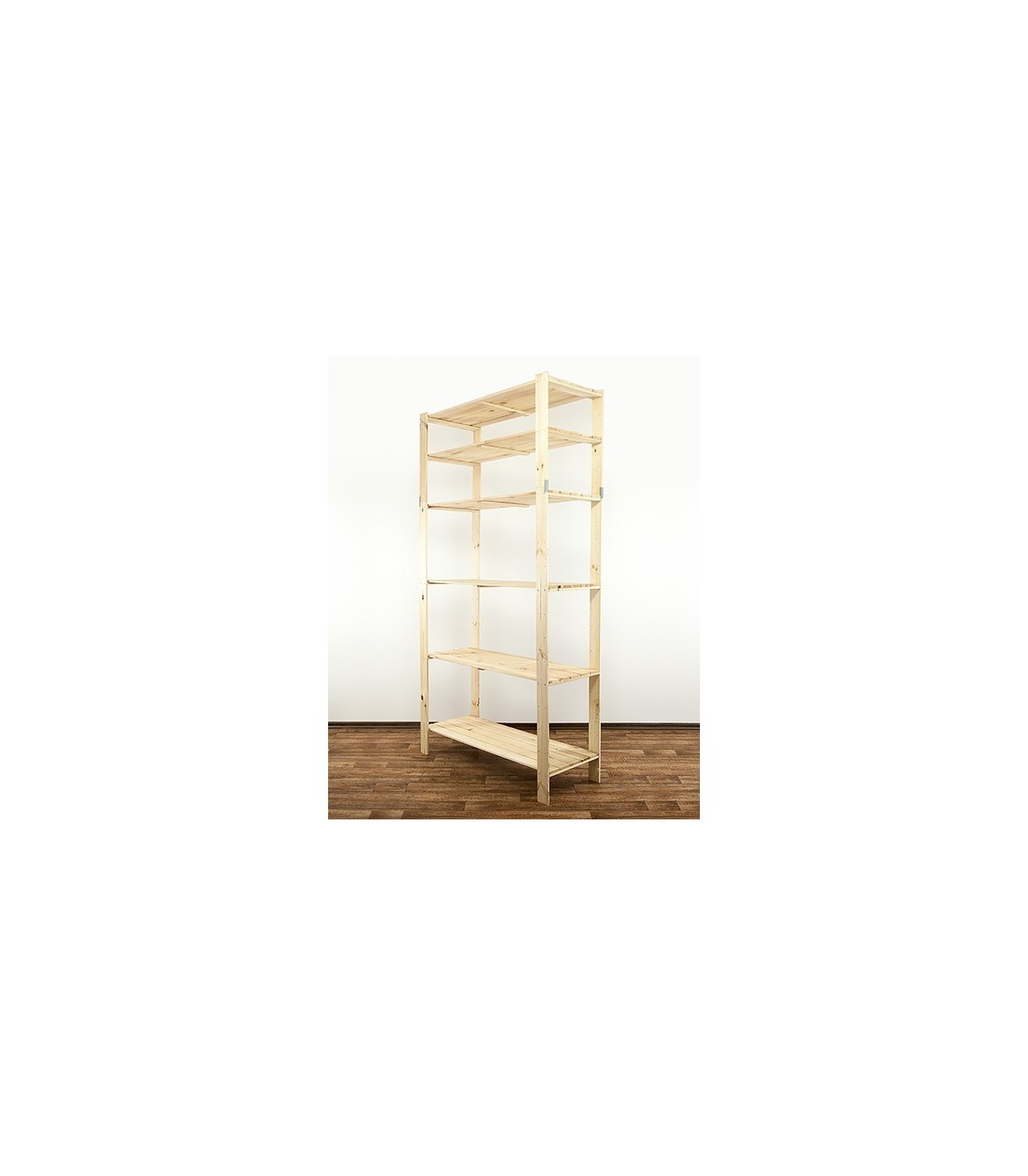 Otwarty regał sosnowy do mieszkania lub magazynu z ażurowymi półkami o nośności 100 kg każda. Sześciopiętrowy stojak z zamocowaną nadstawką, którą można w dowolnej chwili odinstalować i postawić osobno.