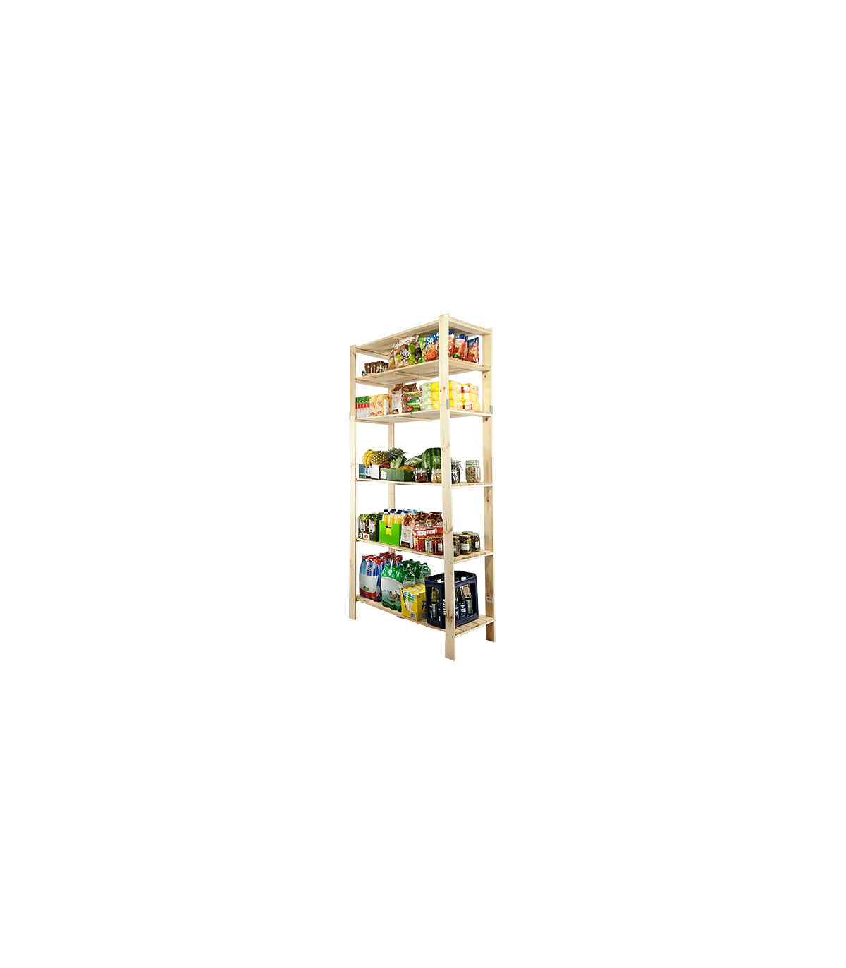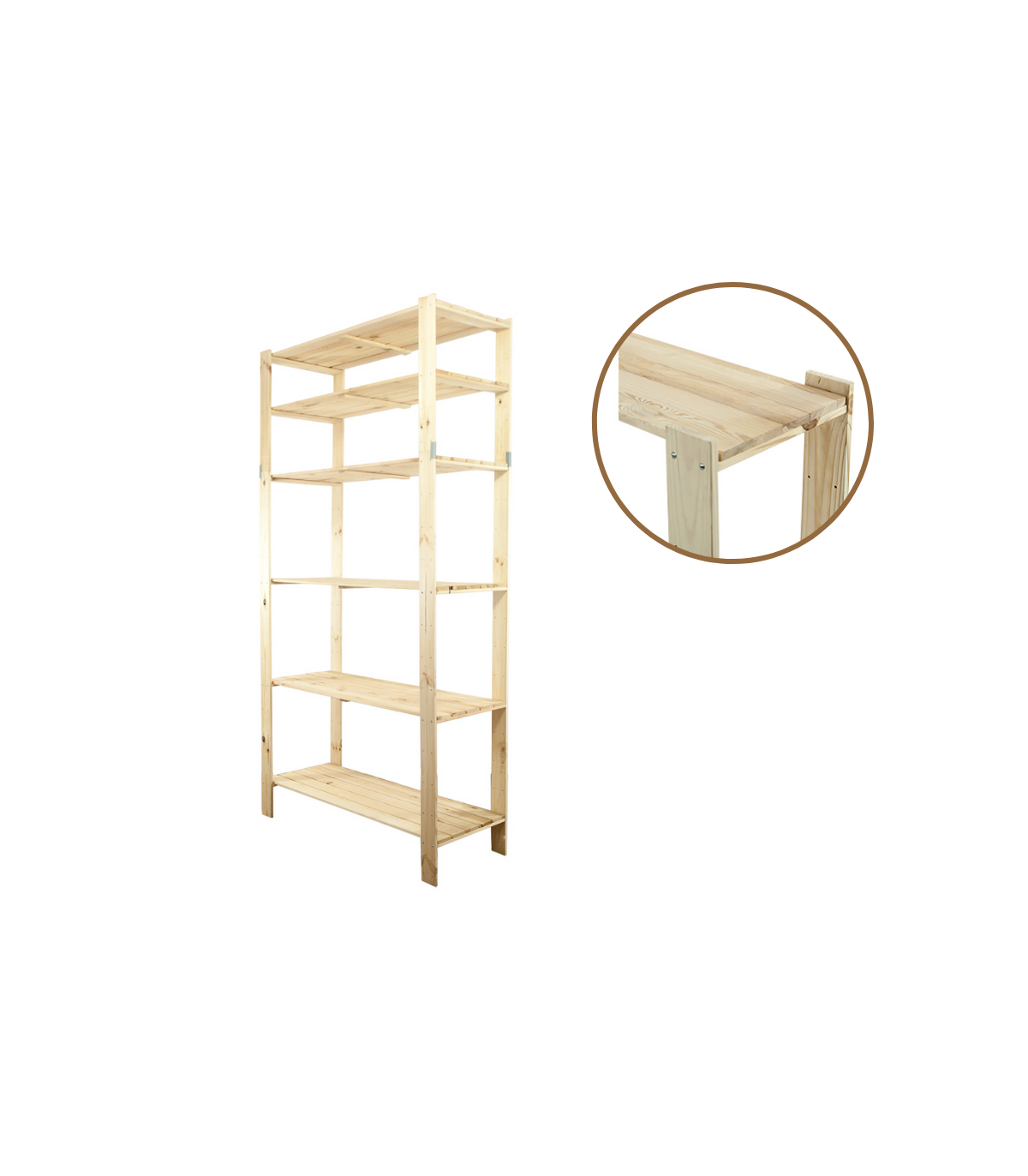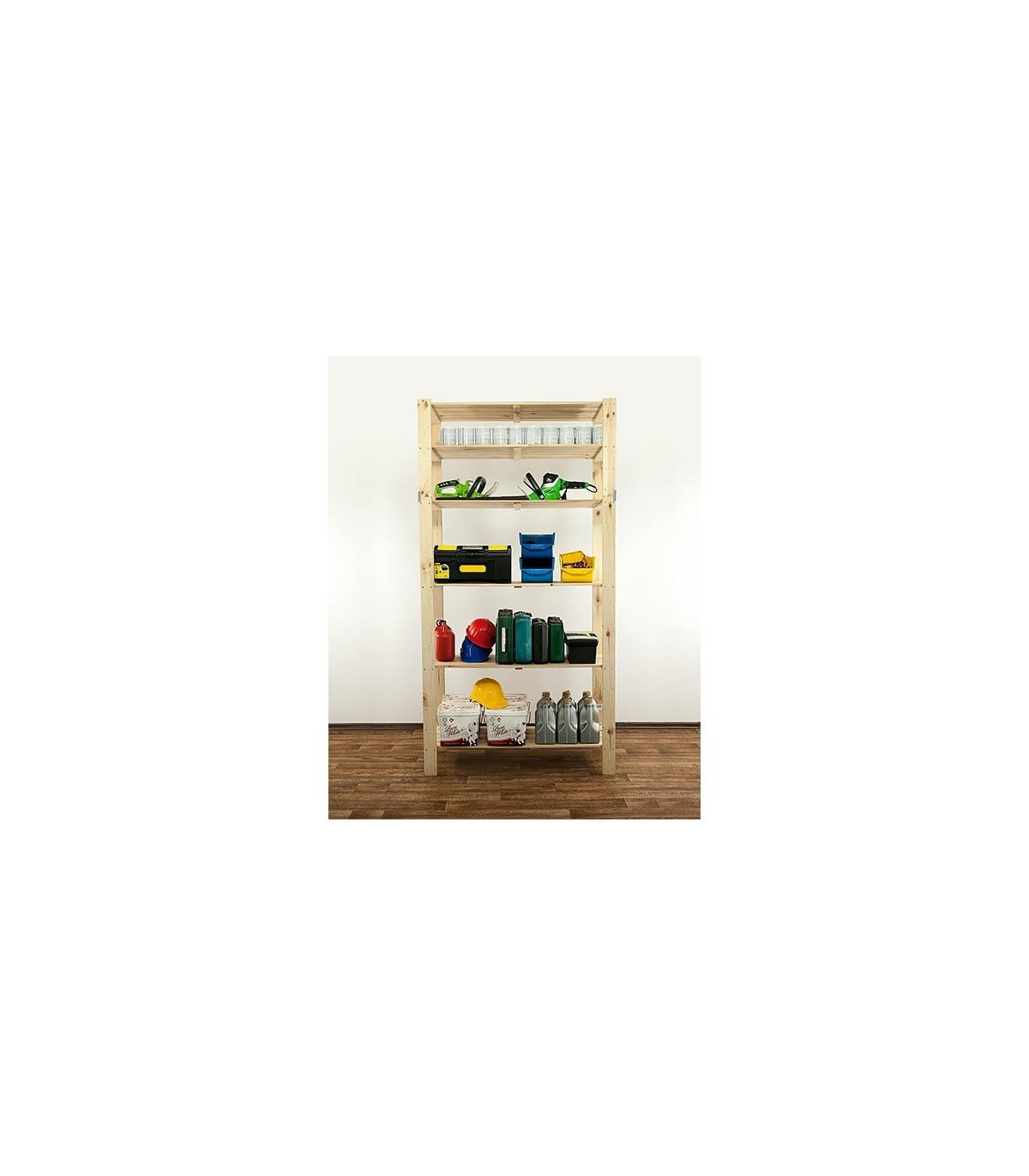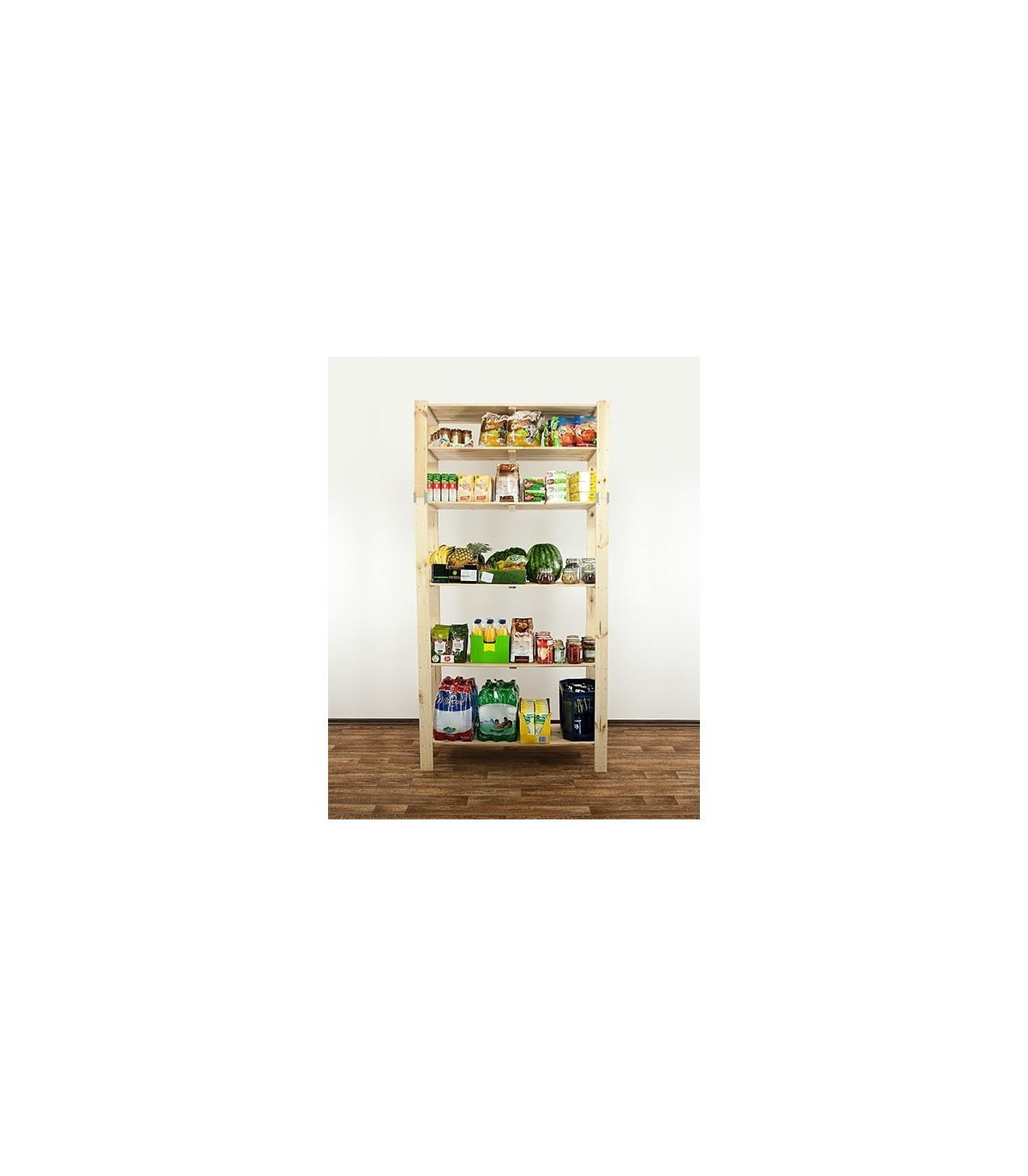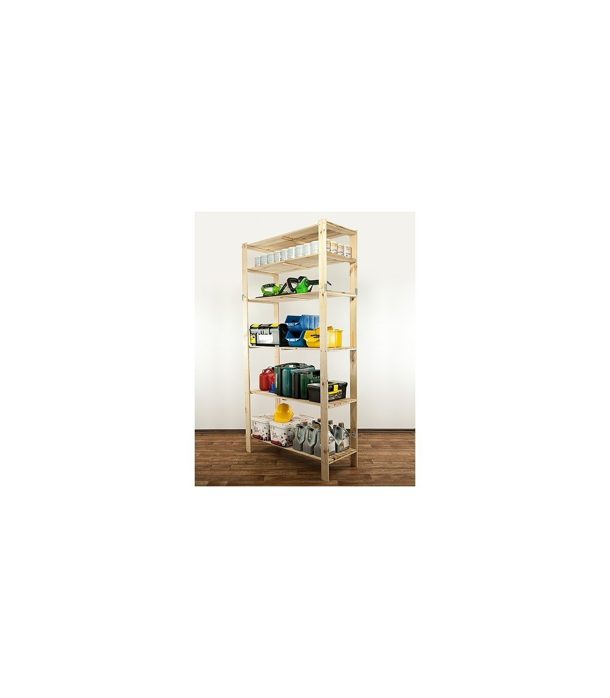 Otwarty regał sosnowy do mieszkania lub magazynu z ażurowymi półkami o nośności 100 kg każda. Sześciopiętrowy stojak z zamocowaną nadstawką, którą można w dowolnej chwili odinstalować i postawić osobno.