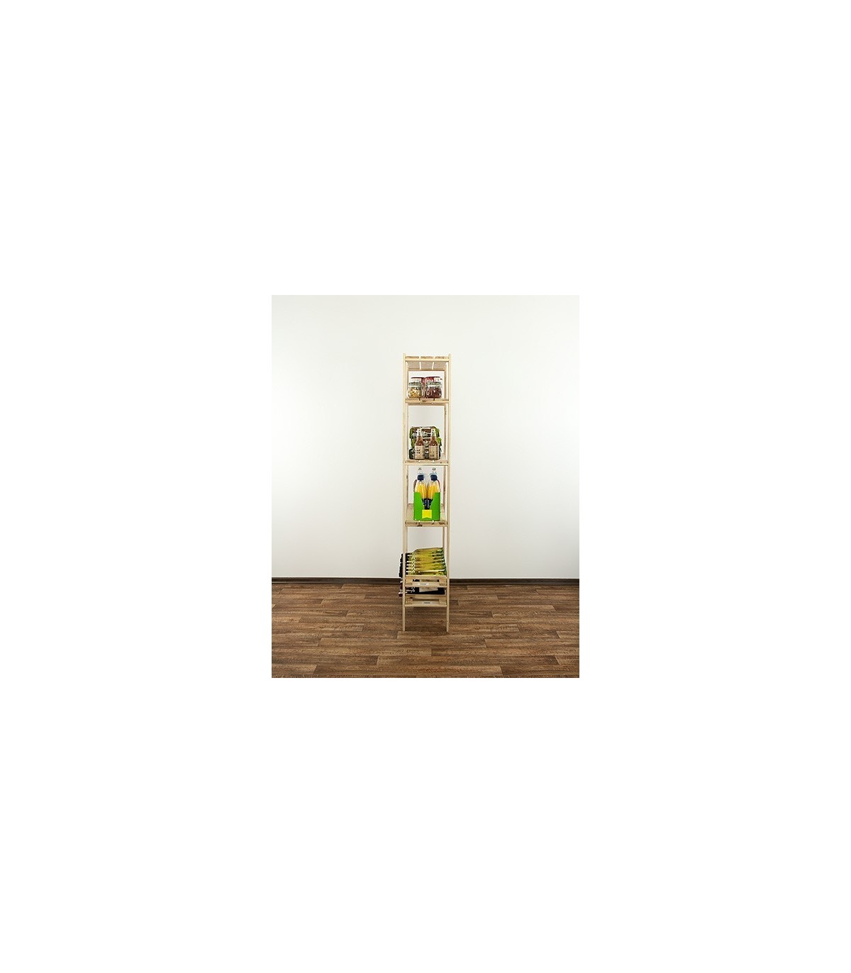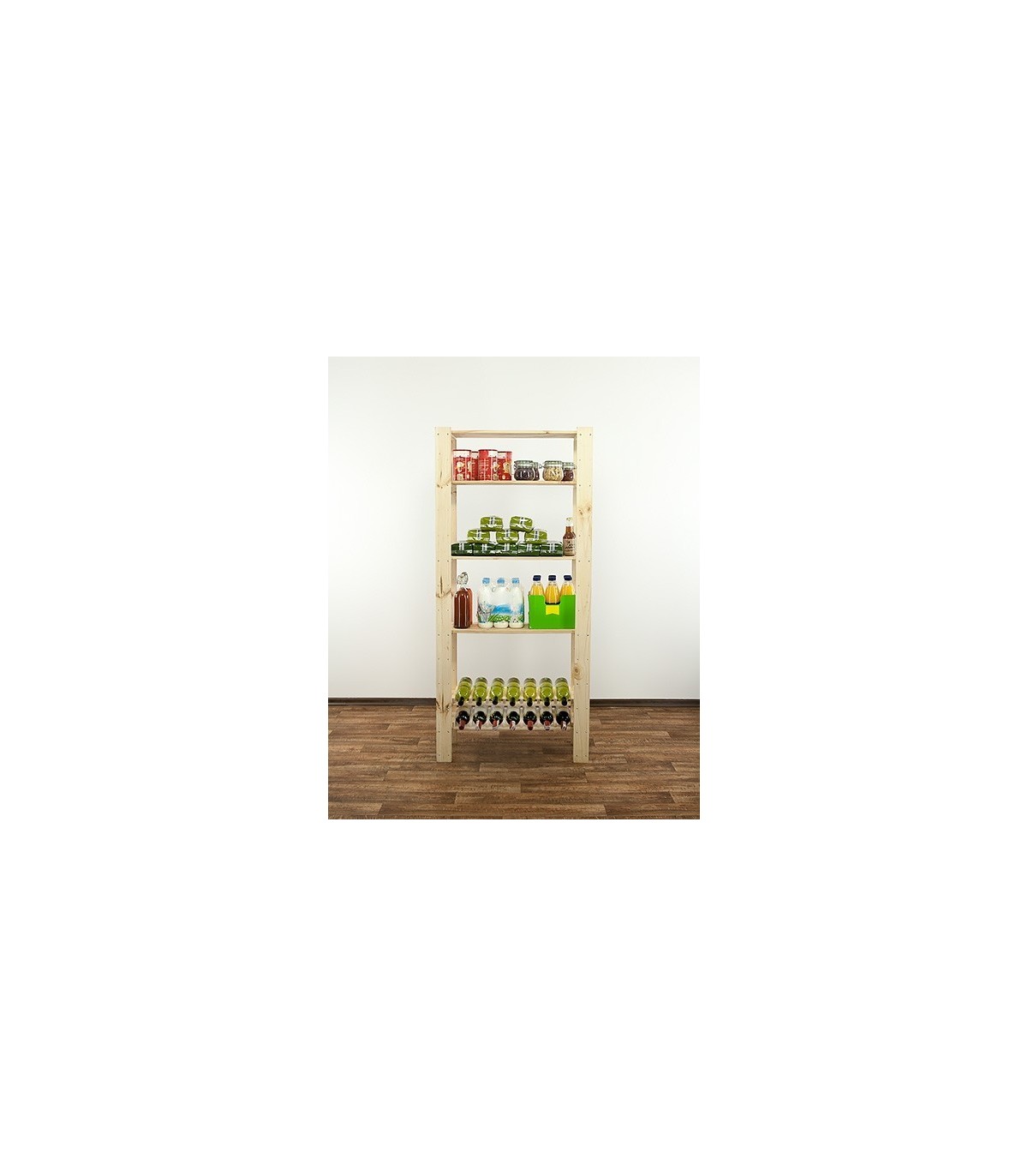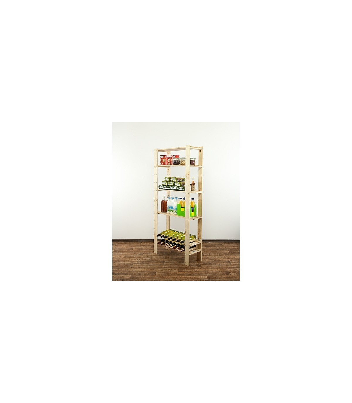 Sześciopiętrowy regał MAXI RW-4L o wysokości 166,4, szerokości 80 i głębokości 30 cm. Mebel wyposażony jest w cztery ażurowe półki o nośności 12o kg oraz dwie, sześcio - przegrodowe półki na butelki. Na listwach pionowych znajdują się dodatkowe otwory montażowe, służące do regulacji odległości poziomów oraz mocowanie blatów dodatkowych.