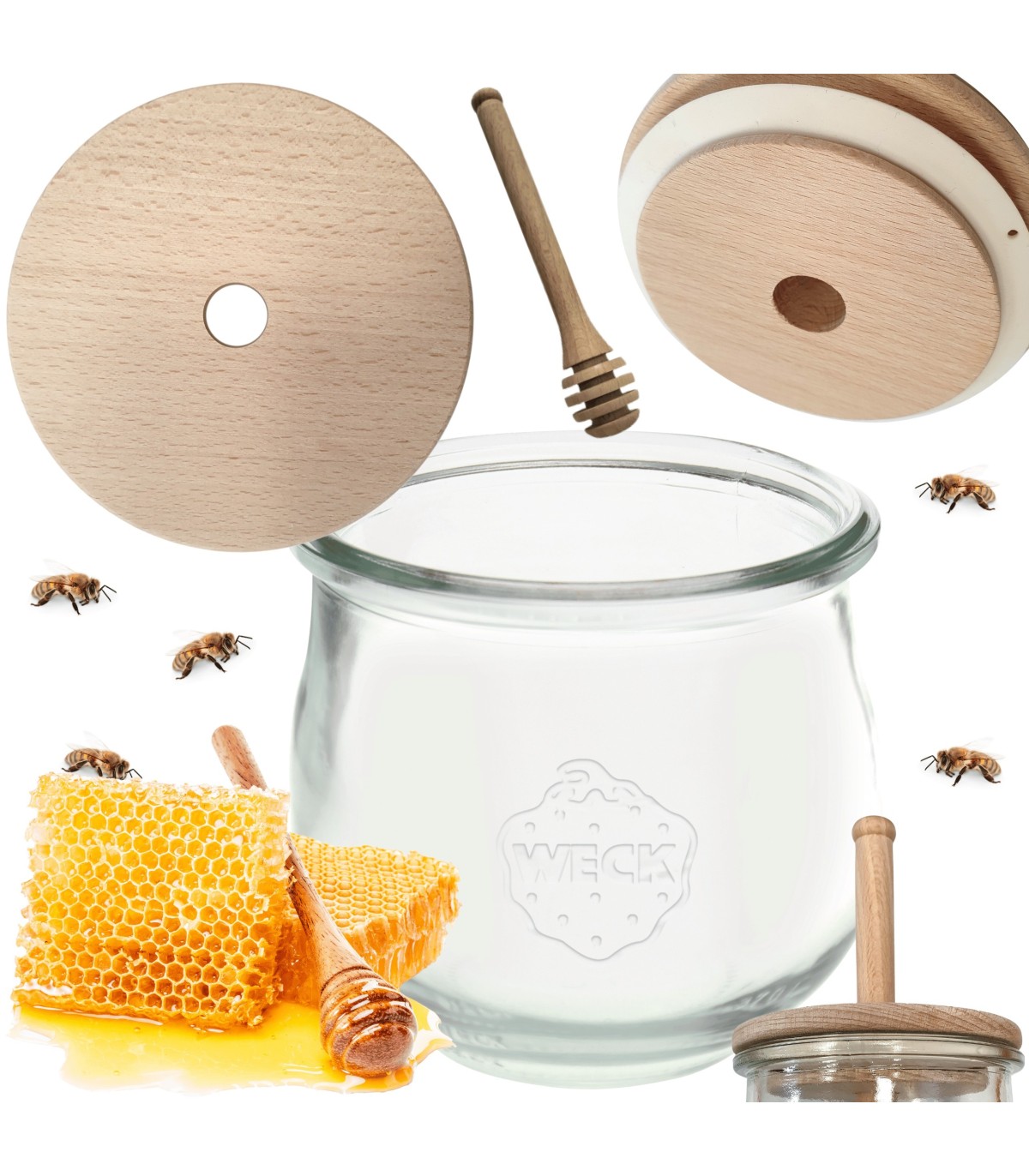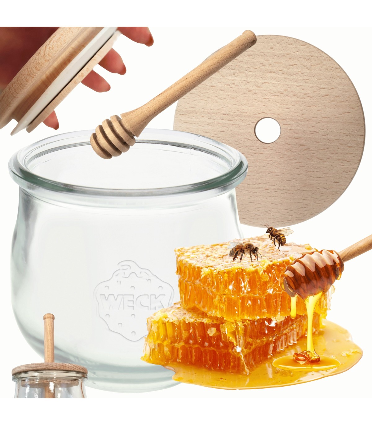 Bezkonkurencyjny słoik do miodu WECK z pokrywką oraz nabierakiem do miodu zaopatrzonymi certyfikatem FSC . Słoiki na lata, z ponad 120-letnią tradycją!