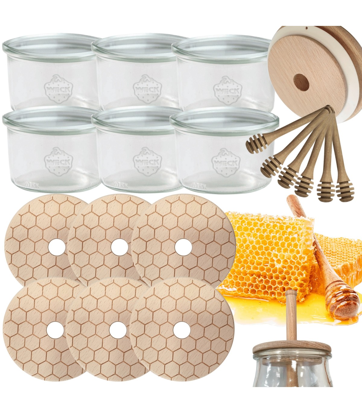 • Zestaw zawiera: słoik (6szt), drewniane wieko z uszczelką (6szt) oraz nabierak do miodu (6szt).