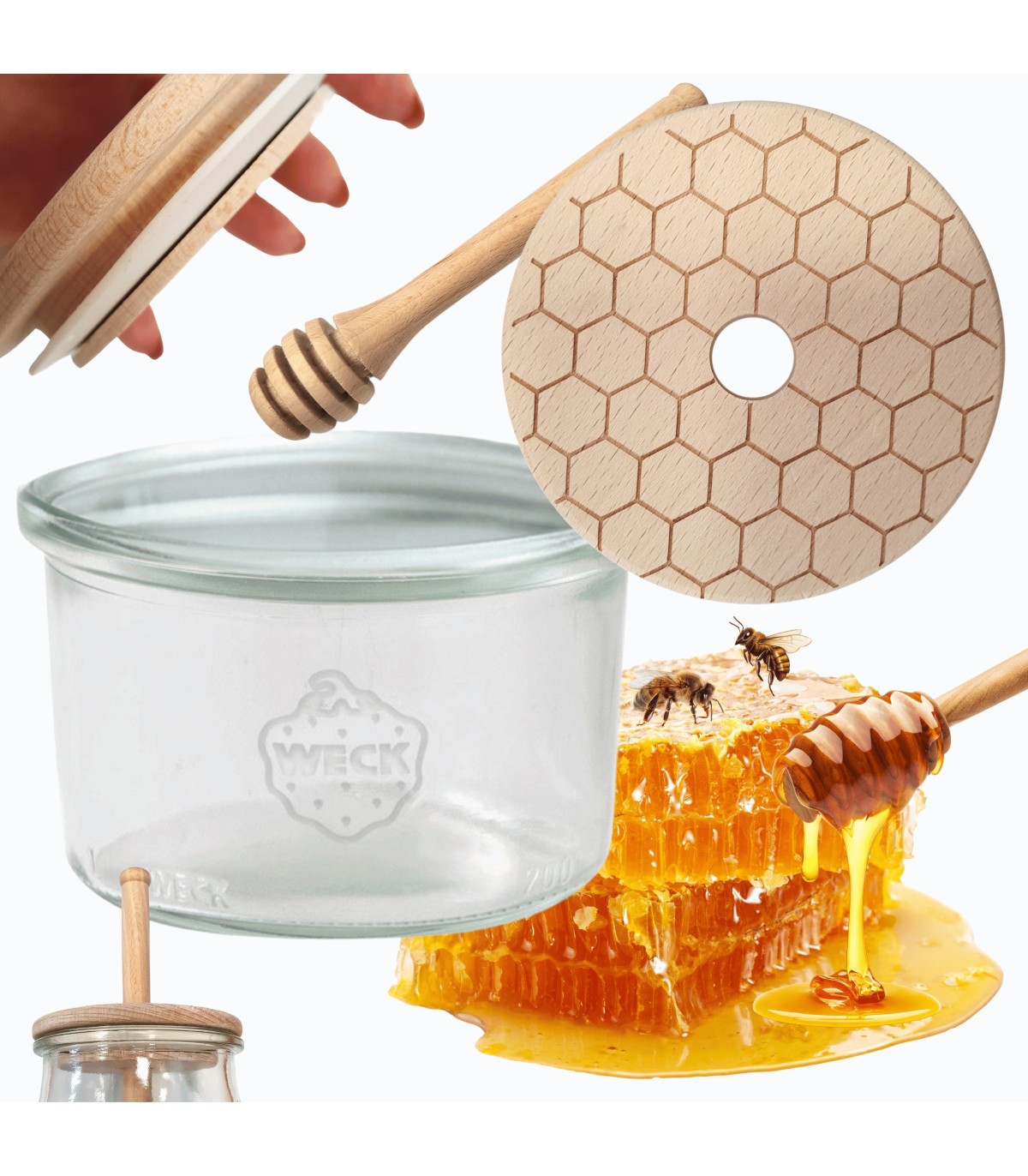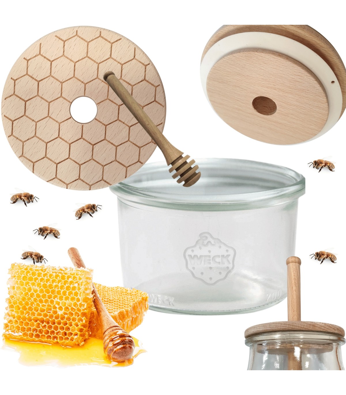 Bezkonkurencyjny słoik do miodu WECK z pokrywką oraz nabierakiem do miodu zaopatrzonymi certyfikatem FSC . Słoiki na lata, z ponad 120-letnią tradycją!