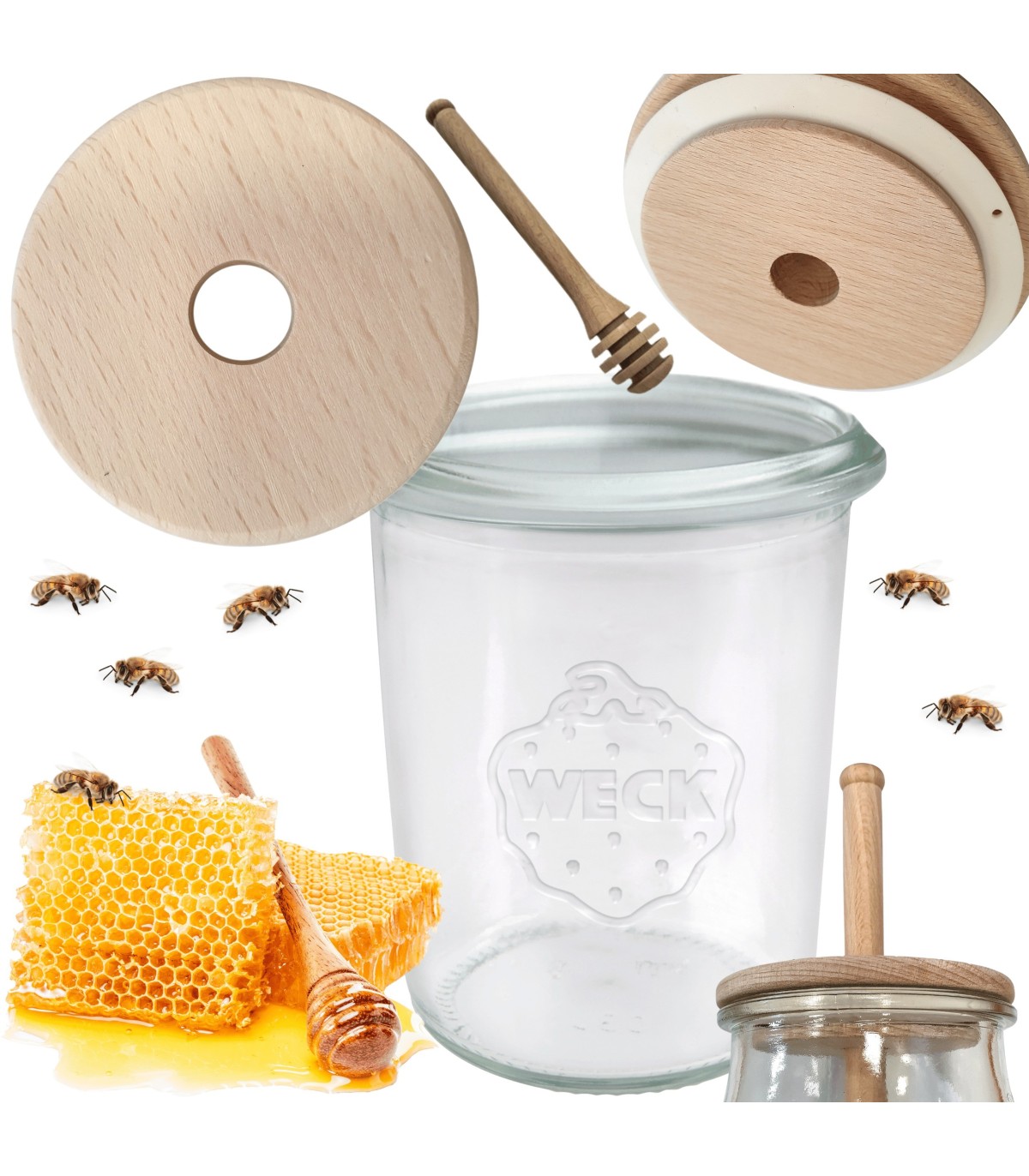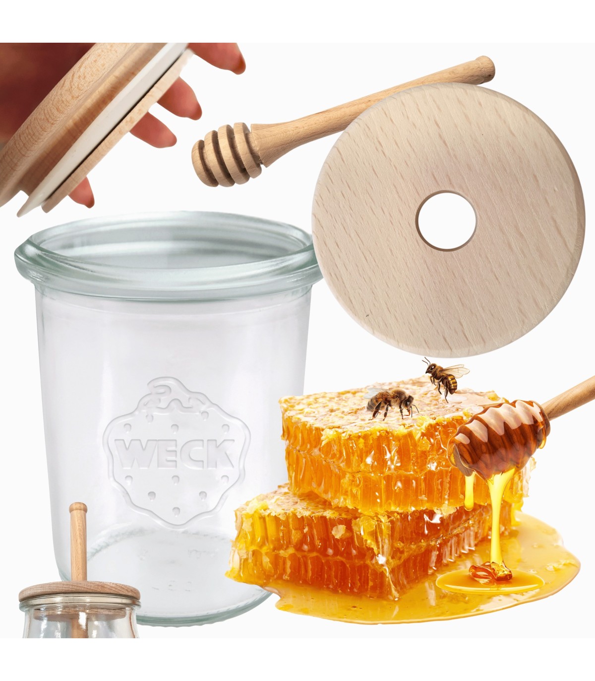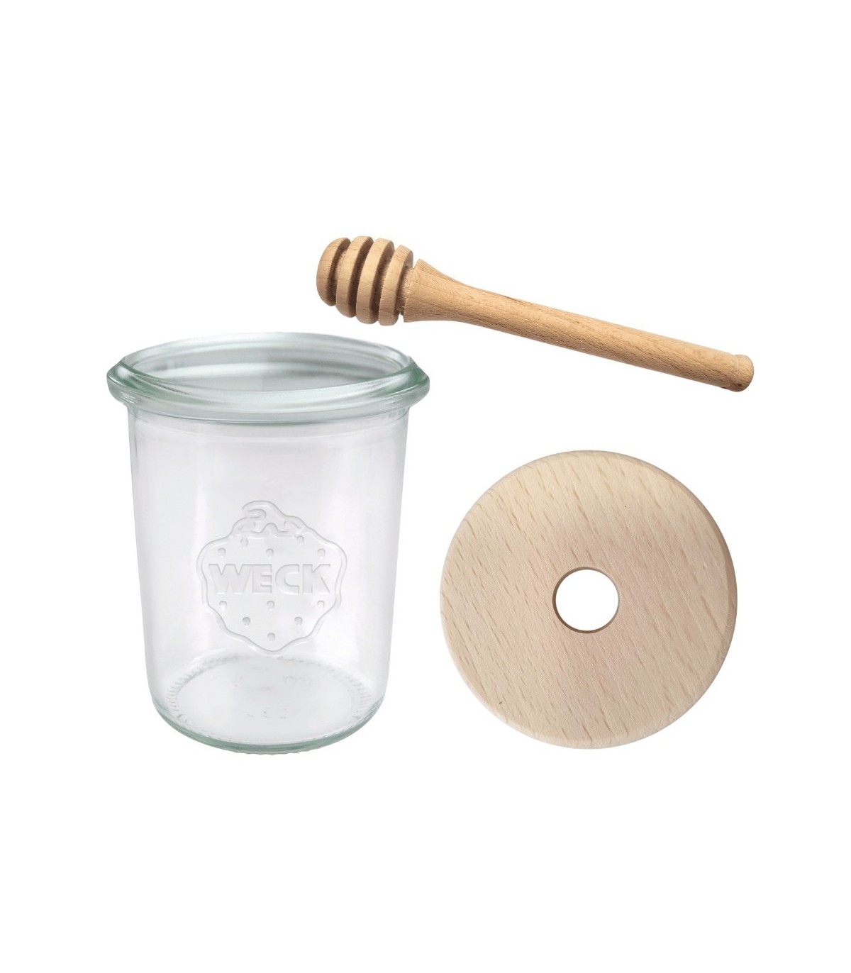 Bezkonkurencyjny słoik do miodu WECK z pokrywką oraz nabierakiem do miodu zaopatrzonymi certyfikatem FSC . Słoiki na lata, z ponad 120-letnią tradycją!