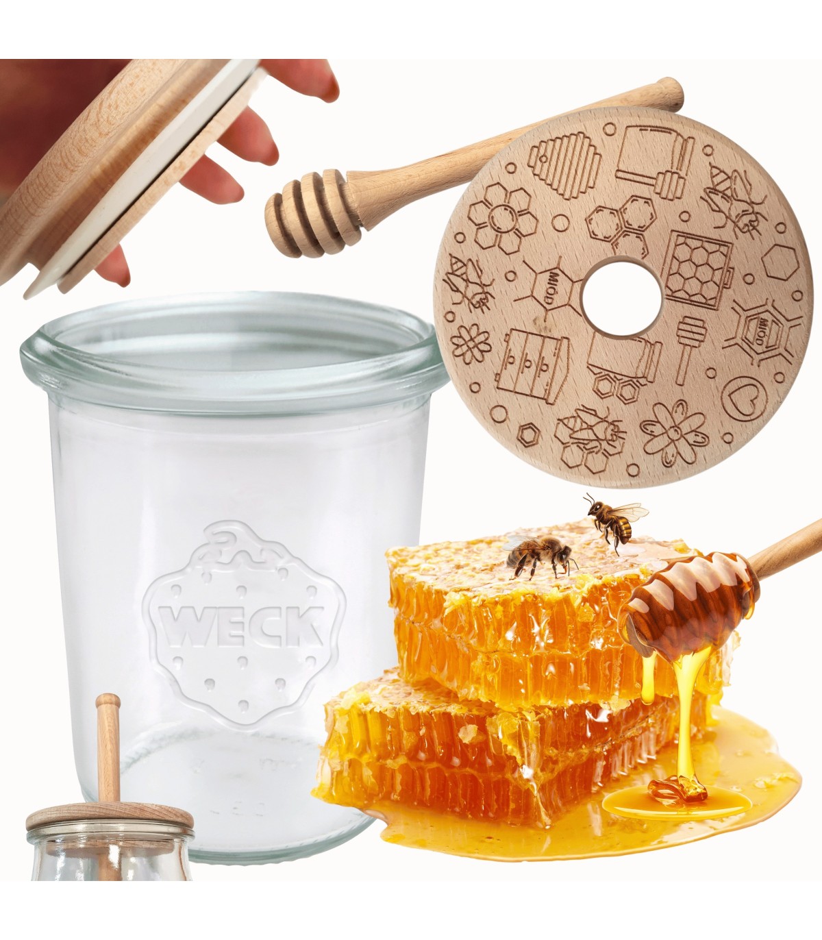 • Zestaw zawiera: słoik, drewniane wieko z uszczelką oraz nabierak do miodu.