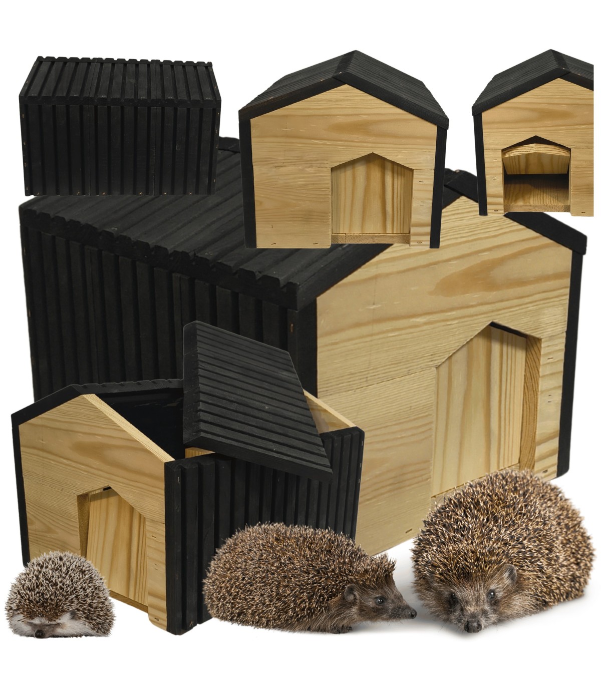 Nasze domki dla jeży dostępne są w kilku atrakcyjnych wariantach: naturalnym, zielonym, czarnym i brązowym.