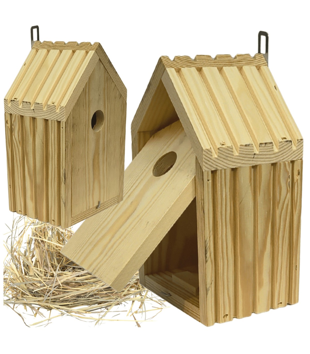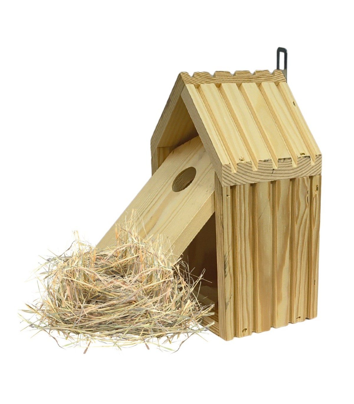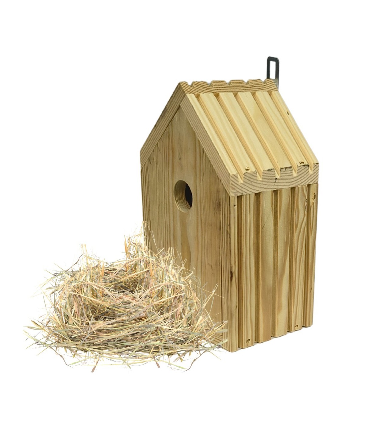 Budki lęgowe dostępne są także w wersji bez i z naturalnym siankiem, które pełni rolę gotowego wypełnienia i dodatkowej izolacji.