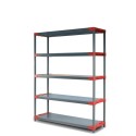 Głęboki na 40 cm, czarny regał ELARA, o wysokości 180 i szerokości 100 cm. Stojak z 5 półkami, każda z udźwigiem 130 kg. Pełne blaty z kształtowanej mechanicznie blachy o grubości 0.9 mm, wzmacniane z dołu wspornikami. Konstrukcja malowana proszkowo.