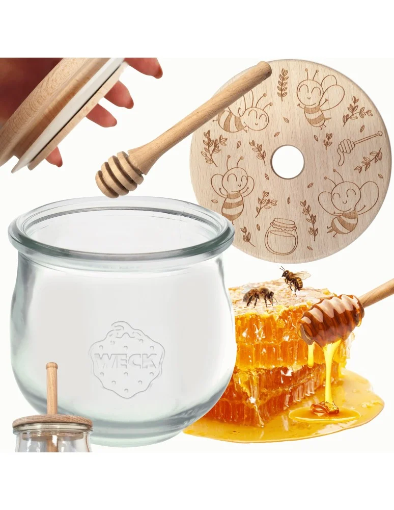 Bezkonkurencyjny słoik do miodu WECK z pokrywką oraz nabierakiem do miodu zaopatrzonymi certyfikatem FSC . Słoiki na lata, z ponad 120-letnią tradycją!