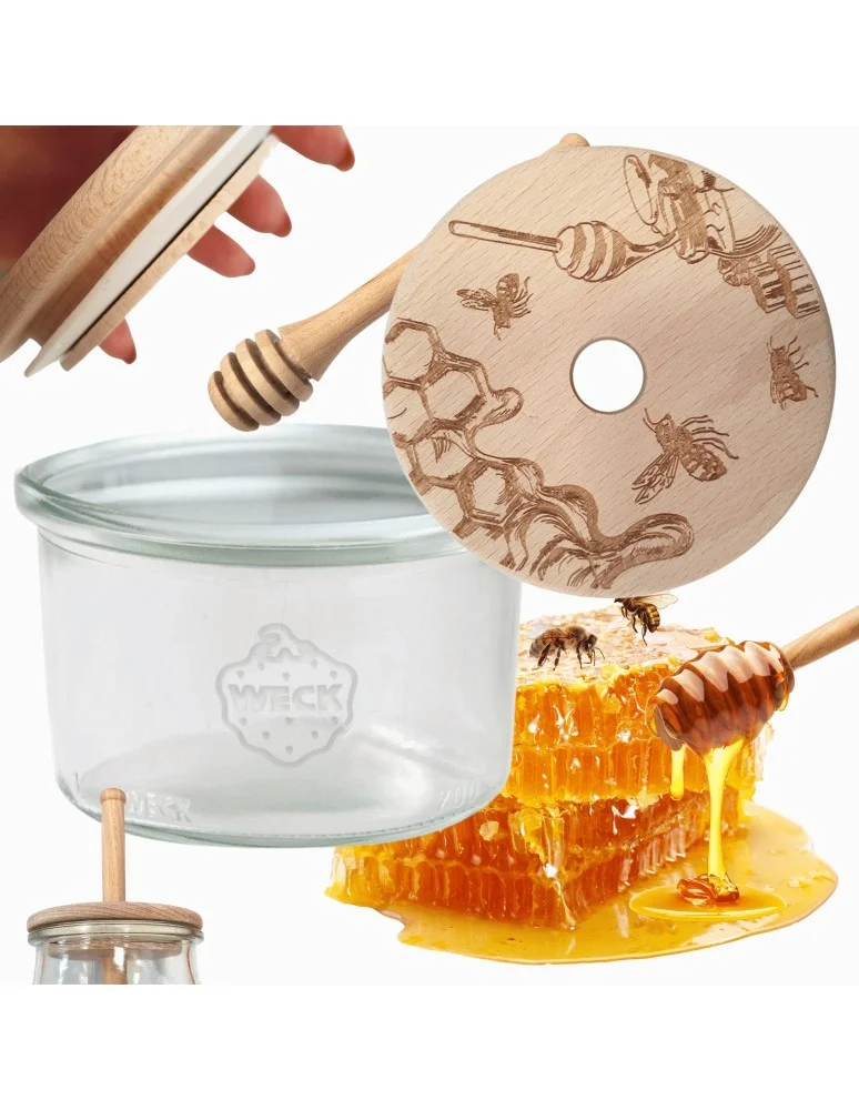 Bezkonkurencyjny słoik do miodu WECK z pokrywką oraz nabierakiem do miodu zaopatrzonymi certyfikatem FSC . Słoiki na lata, z ponad 120-letnią tradycją!