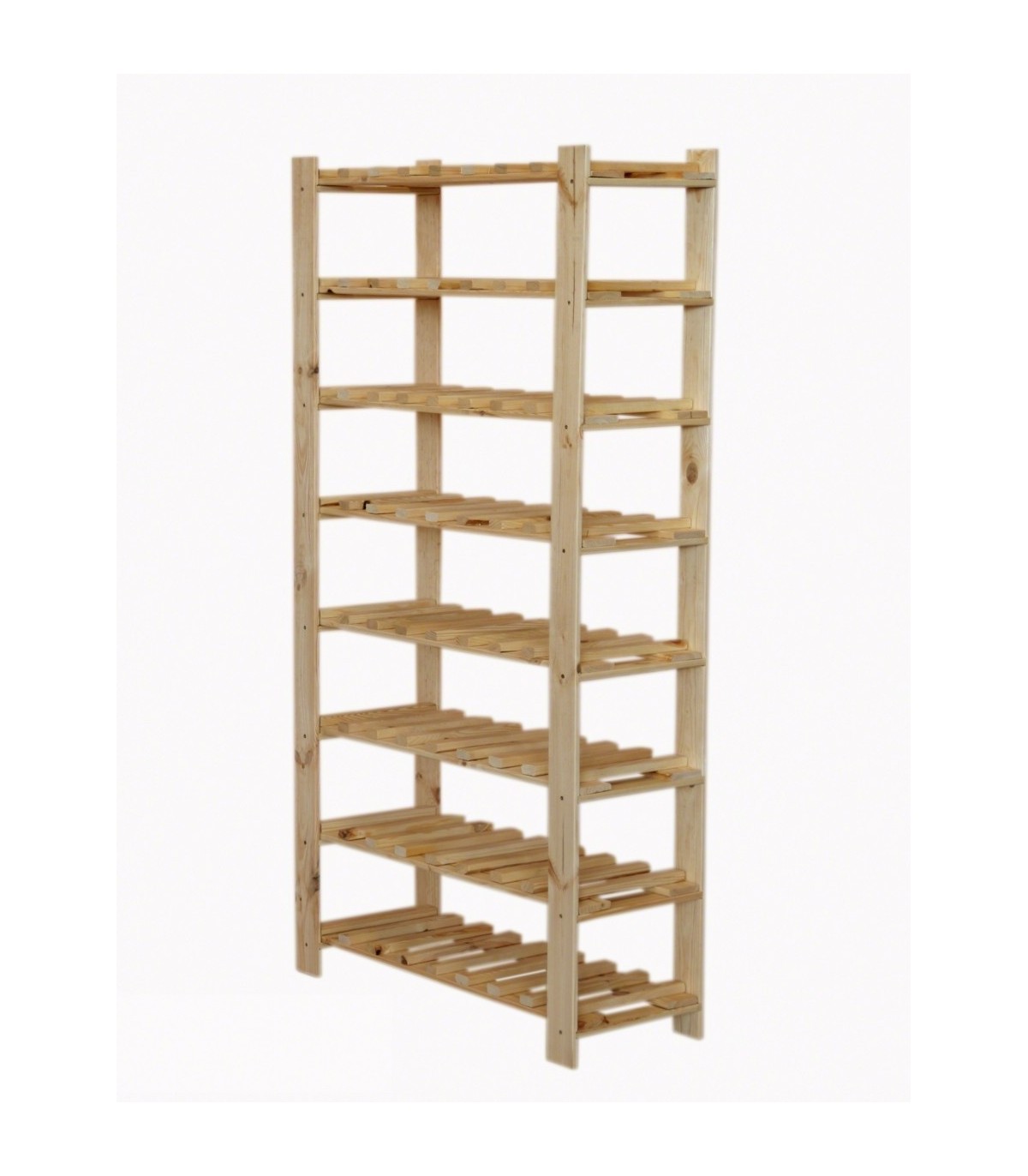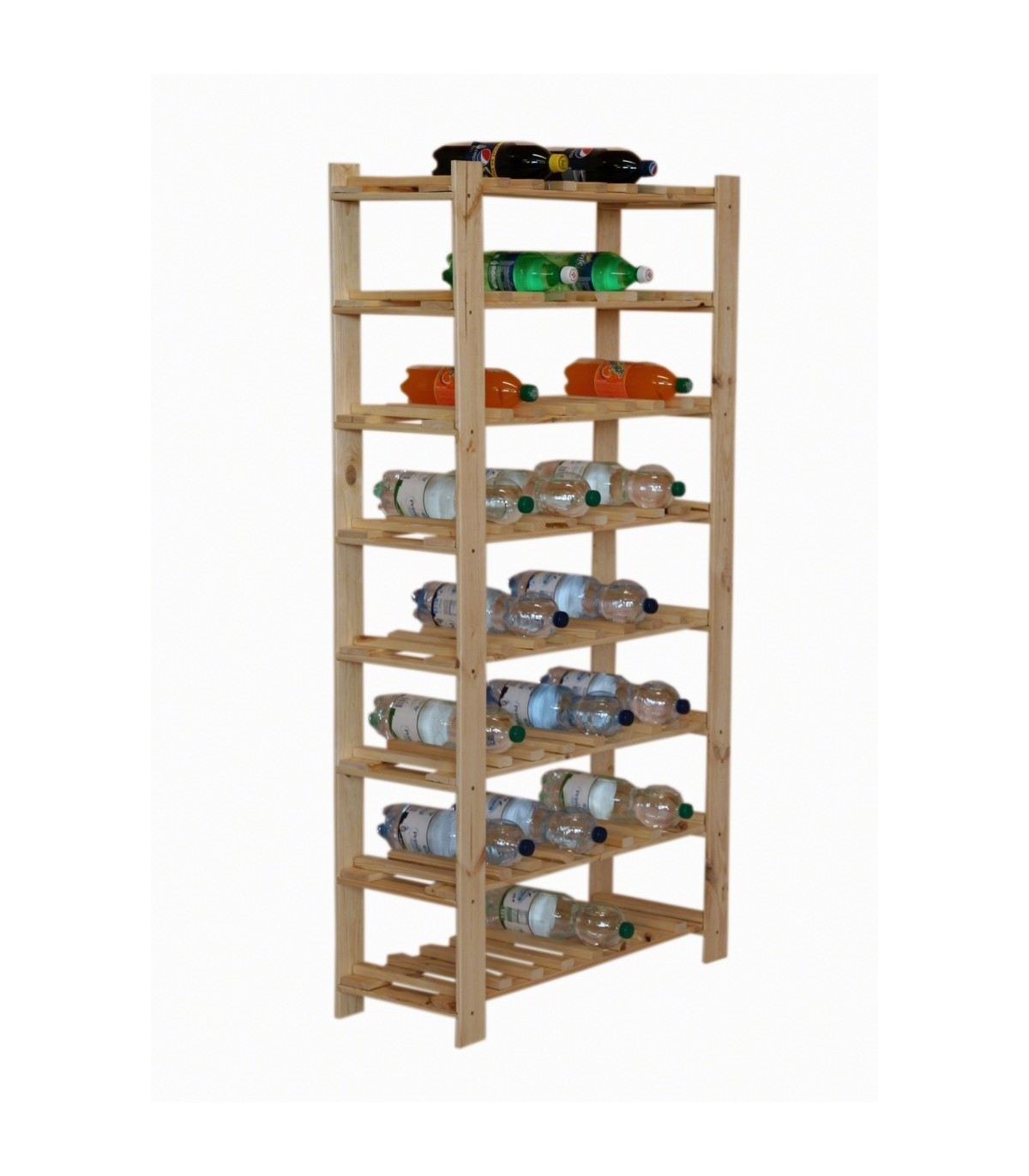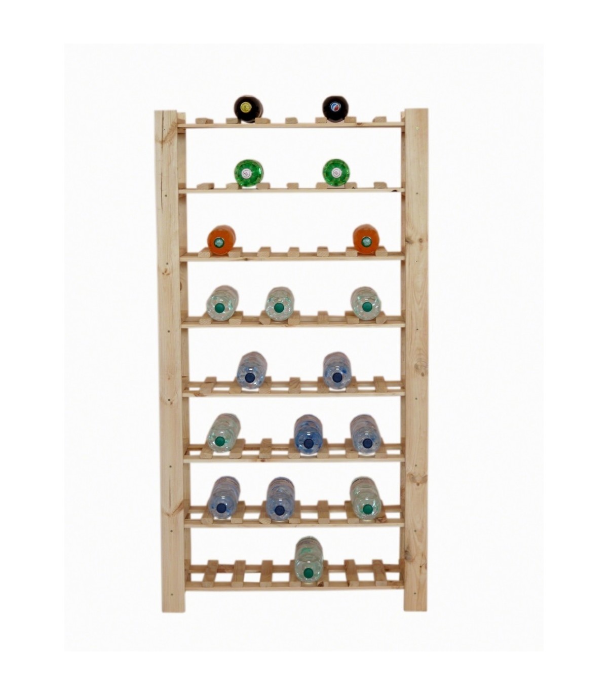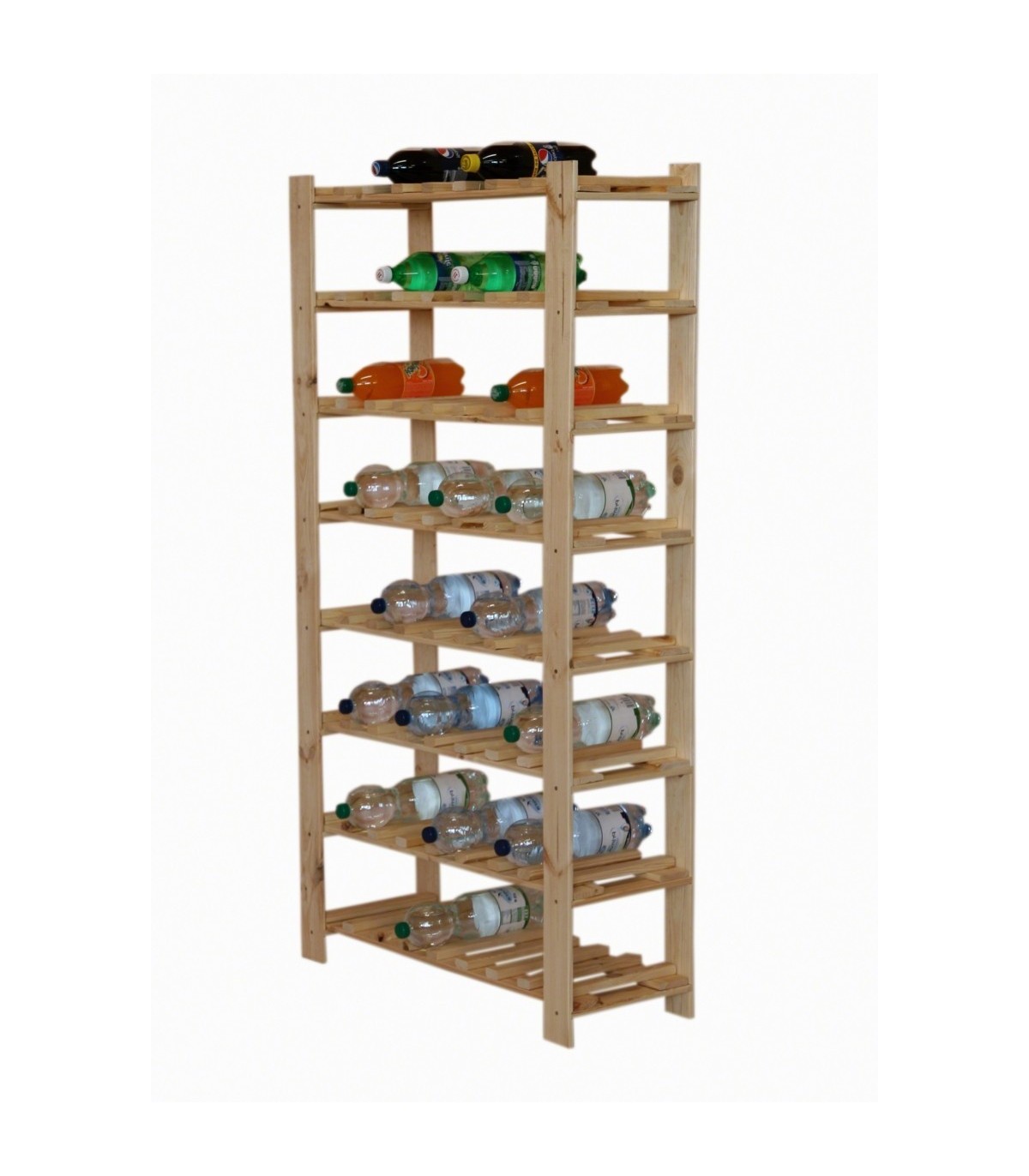 Wysoki na 180 cm nowoczesny regał z drewna sosnowego o szerokości 80 i głębokości 30 cm. Stojak wyposażony w ażurowe leżnie na butelki. Na każdym z ośmiu pięter, może leżakować w bezpiecznej odległości od siebie po osiem sztuk pojemników szklanych z napojami, przetworami domowej roboty, winem i innymi alkoholami. Leżnie na butelki można z powodzeniem stosować naprzemiennie z półkami zwykłymi.