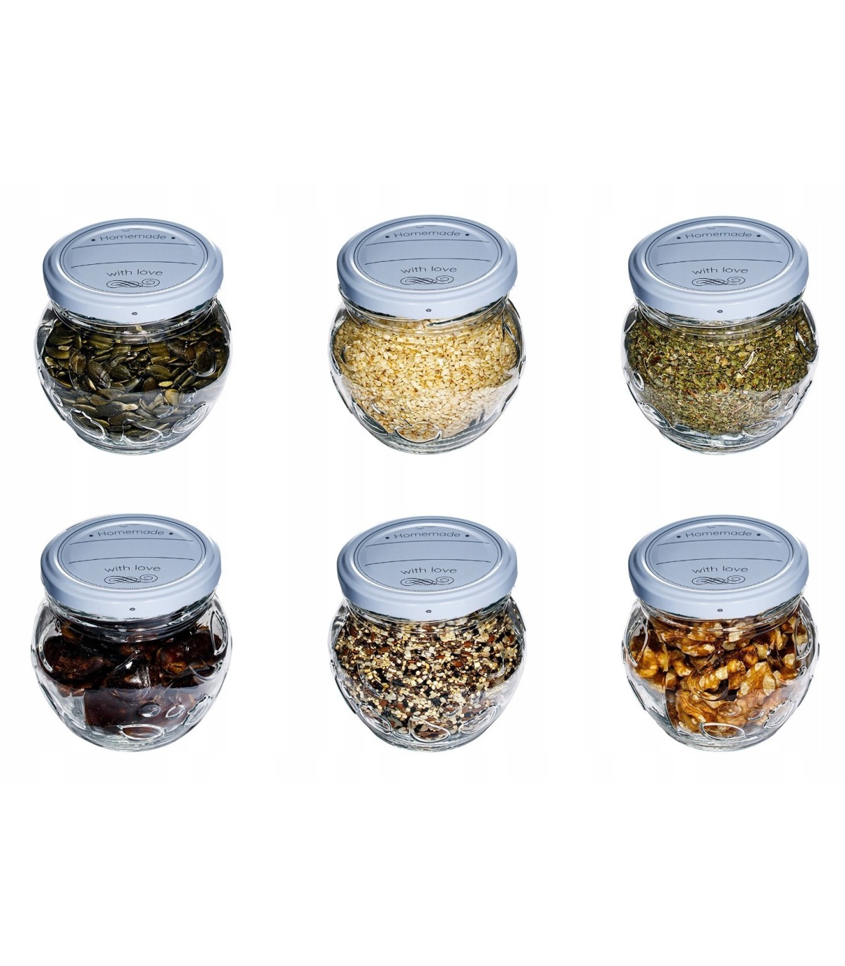 • W zestawie znajduje się sześć słoików z atestem żywnościowym.
