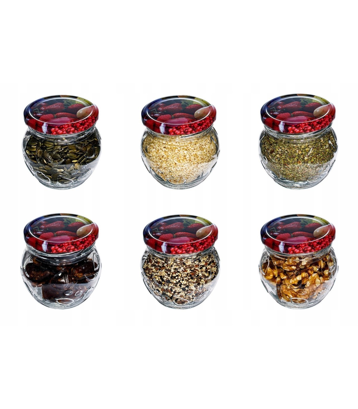 PARAMETRY: Na innych naszych aukcjach zakupisz pozostałe wzory nakrętek i pojemności słoików: UWAGA: Słoiki sprzedawane są puste, w komplecie z nakrętkami, bez wypełnienia.