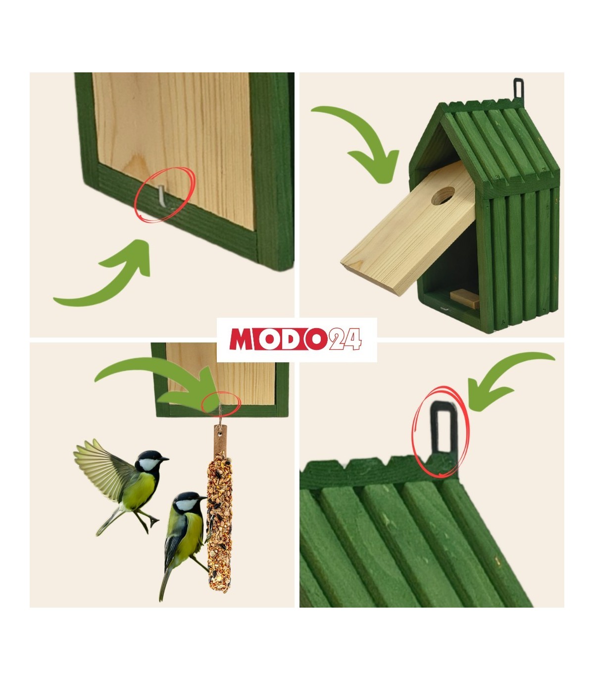 ⭐ Każda budka zachowuje swój naturalny, lamelowy charakter, który sprawia, że jest nie tylko schronieniem dla ptaków, ale również ozdobą tarasu, działki czy ogrodu.