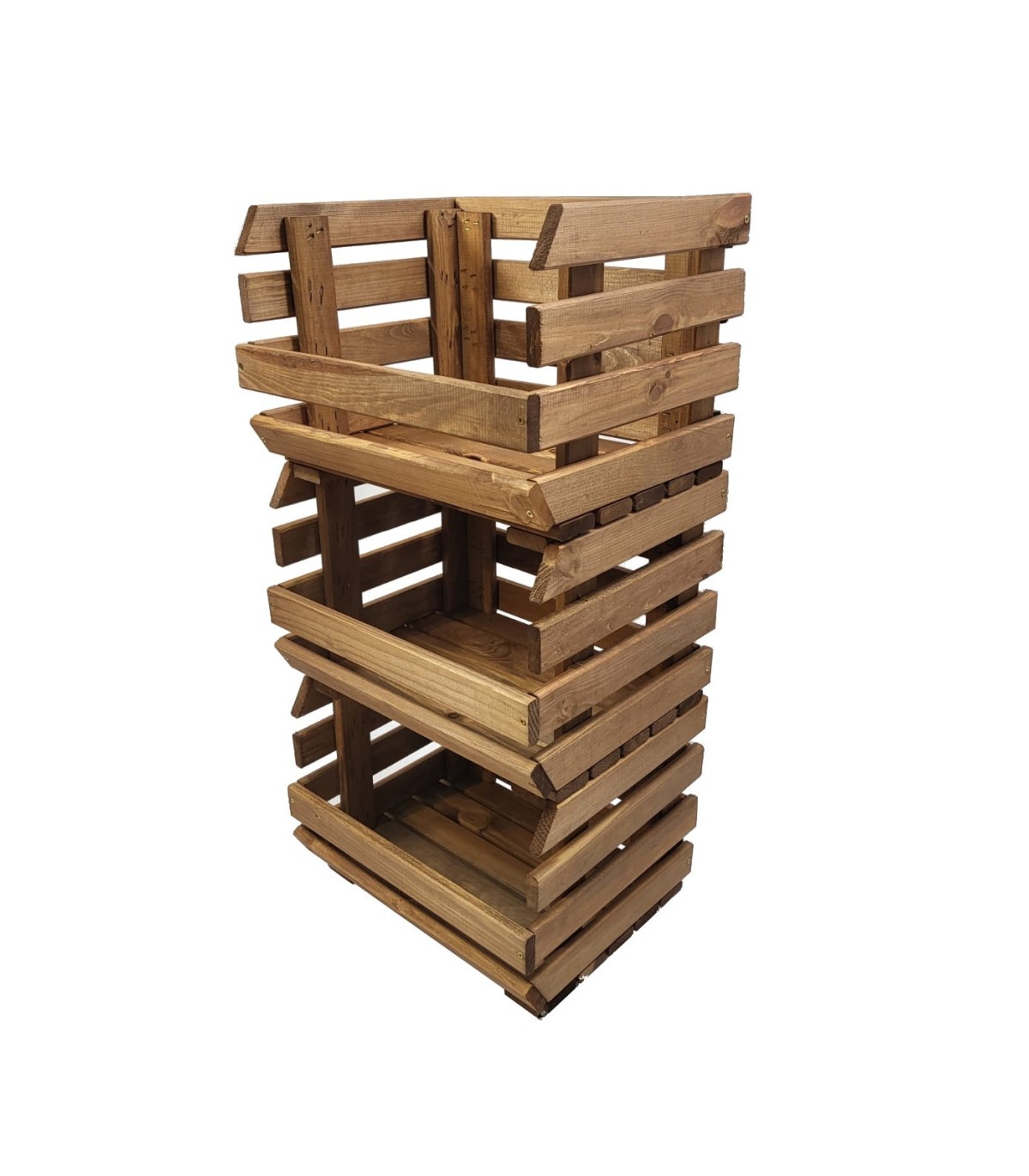 Trzypoziomowy pojemnik na owoce i warzywa. Regał skrzynkowy do sklepu lub spiżarni.