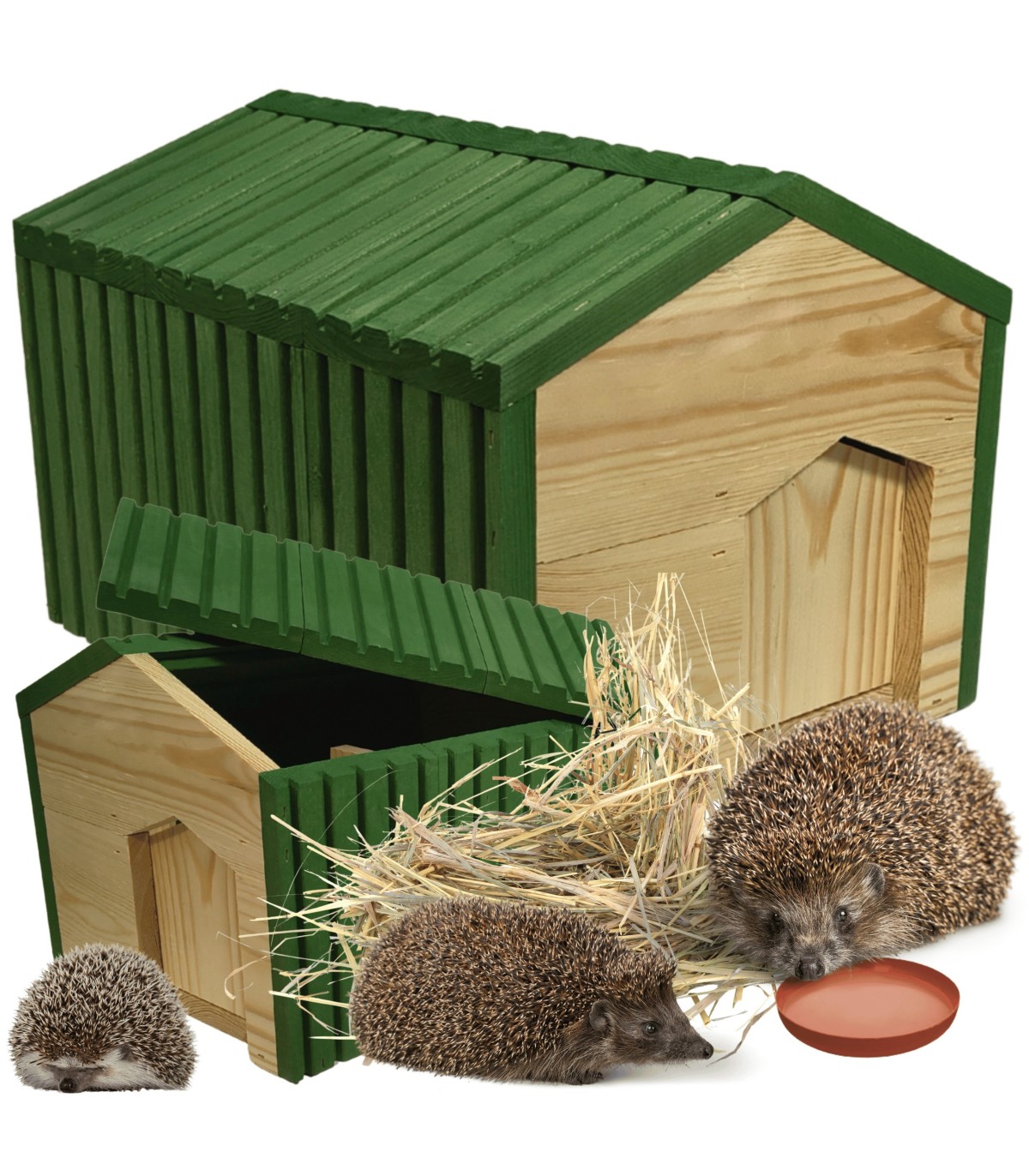 Domki dla jeży dostępne są także w wersji bez i z naturalnym siankiem i praktyczną miseczką, które stanowią gotowe wypełnienie i ułatwiają szybkie zasiedlenie schronienia.