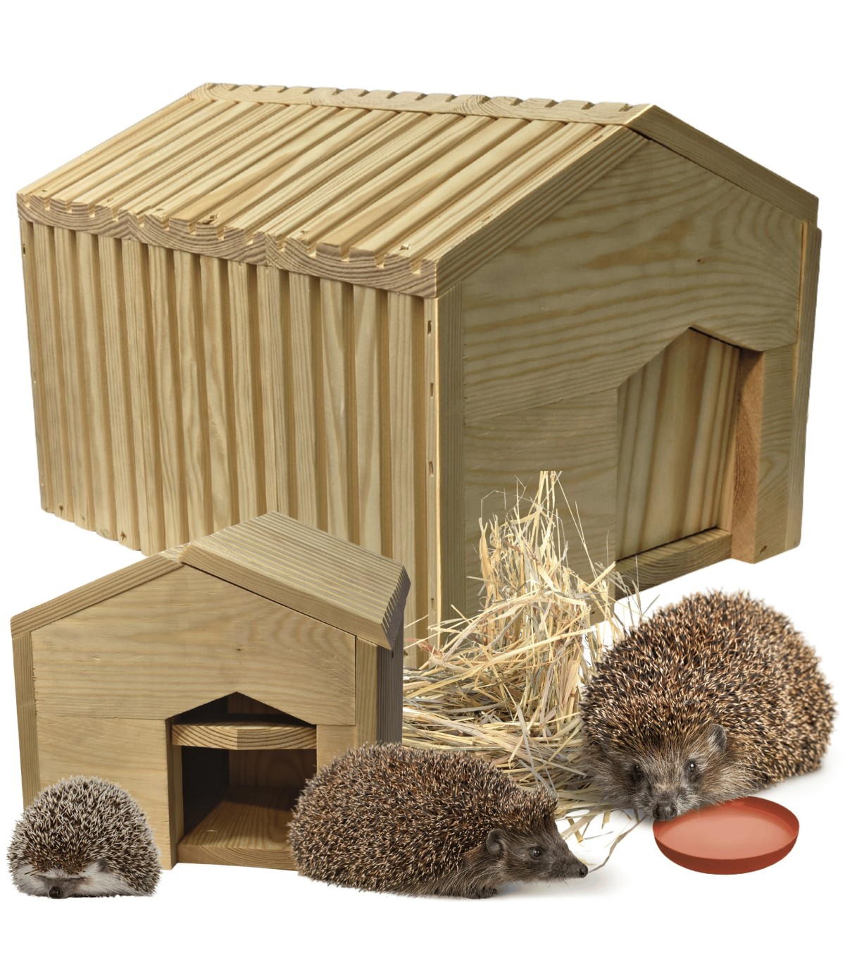 Domki dla jeży dostępne są także w wersji bez i z naturalnym siankiem i praktyczną miseczką, które stanowią gotowe wypełnienie i ułatwiają szybkie zasiedlenie schronienia.