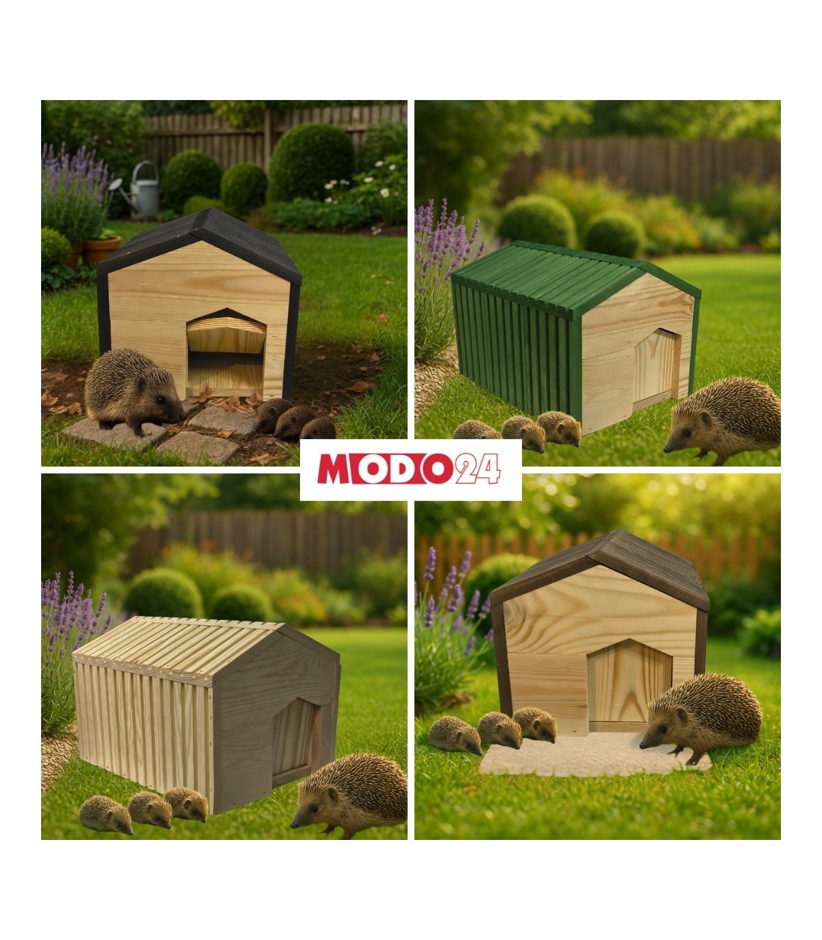 Nasze domki dla jeży dostępne są w kilku atrakcyjnych wariantach: naturalnym, zielonym, czarnym i brązowym.