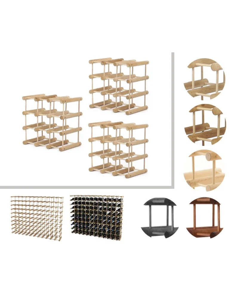 Moduł podstawowy jaki sprzedajemy jest na 9 butelek. Zawiera w składzie 16 drążków i 56 kołków ( w czym 8 szt kołków jest w zapasie do ewentualnego łączenia z innymi modułami).