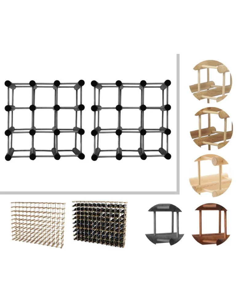 Moduł podstawowy jaki sprzedajemy jest na 9 butelek. Zawiera w składzie 16 drążków i 56 kołków ( w czym 8 szt kołków jest w zapasie do ewentualnego łączenia z innymi modułami).