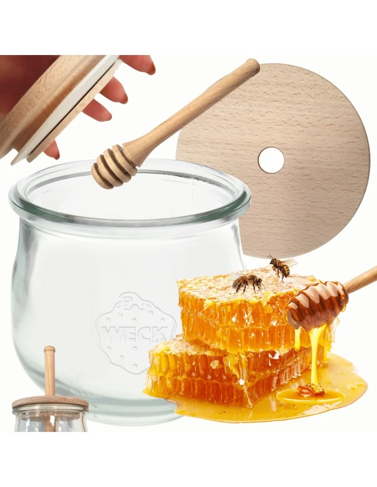 Bezkonkurencyjny słoik do miodu WECK z pokrywką oraz nabierakiem do miodu zaopatrzonymi certyfikatem FSC . Słoiki na lata, z ponad 120-letnią tradycją!
