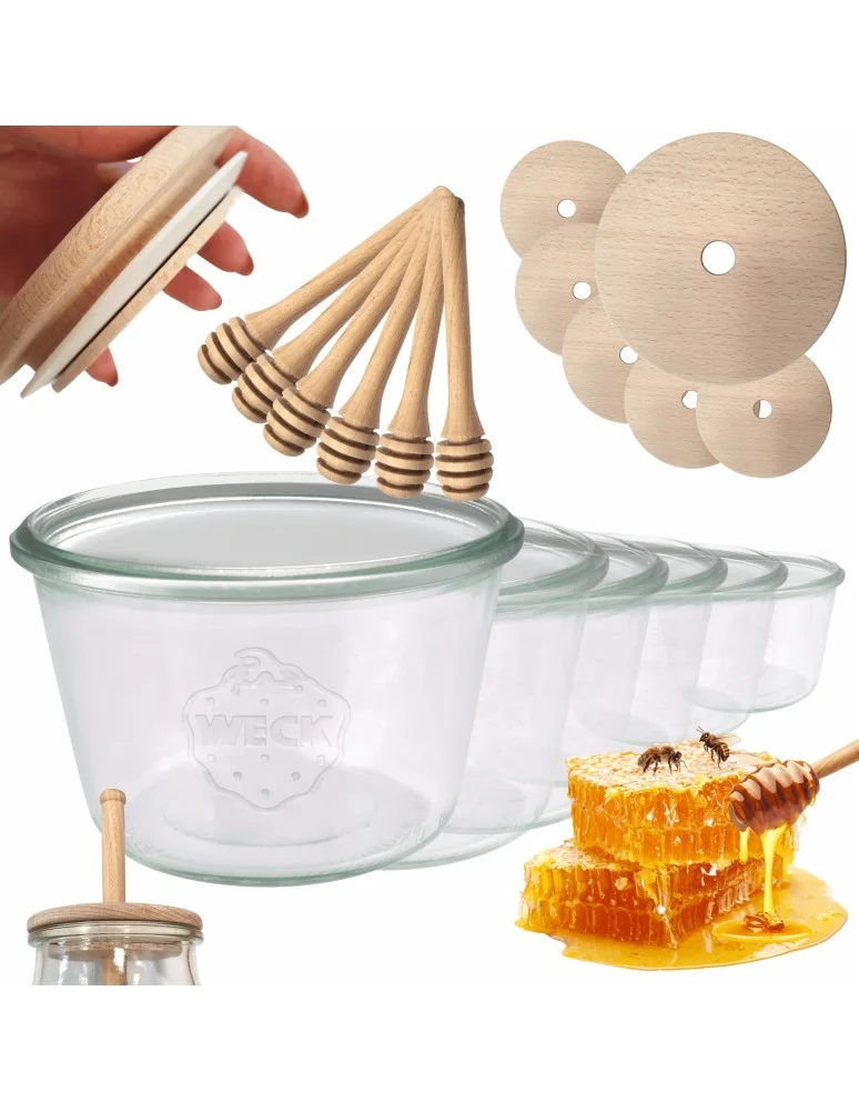 - Zestaw zawiera: słoik (6szt), drewniane wieko z uszczelką (6szt) oraz nabierak do miodu (6szt).