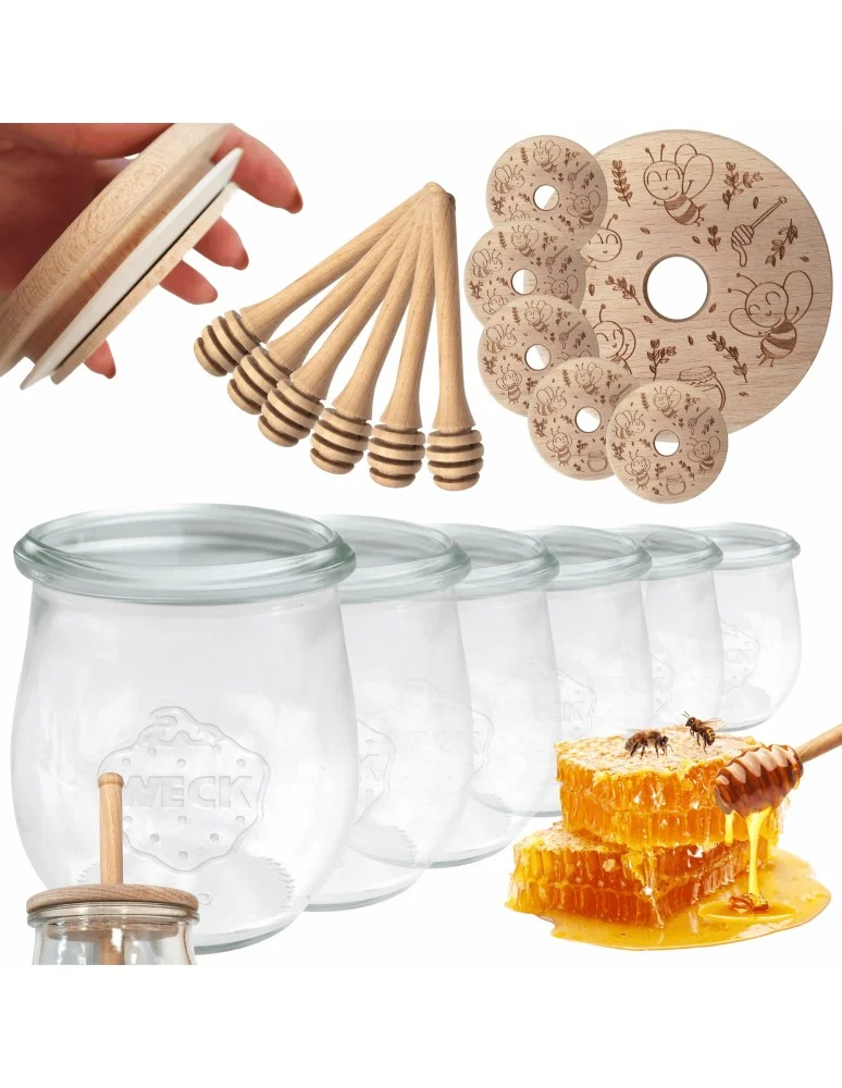 - Zestaw zawiera: słoik (6szt), drewniane wieko z uszczelką (6szt) oraz nabierak do miodu (6szt).