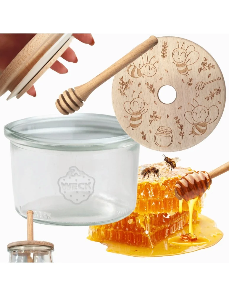 Bezkonkurencyjny słoik do miodu WECK z pokrywką oraz nabierakiem do miodu zaopatrzonymi certyfikatem FSC . Słoiki na lata, z ponad 120-letnią tradycją!